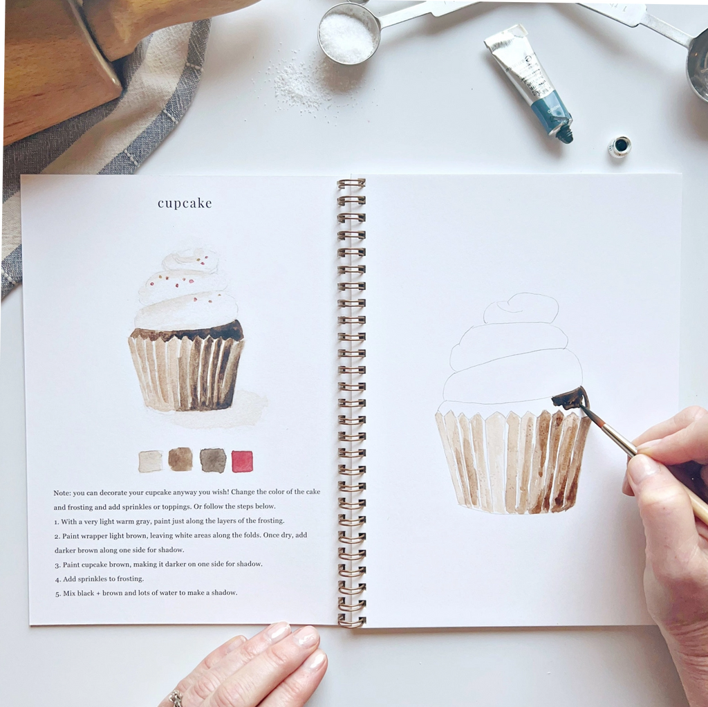 12 different baking-themed illustrations with an example of the finished painting, step-by-step instructions, and a lightly illustrated sketch for you to paint. It's just like a coloring book, but with watercolor! Enjoy this peaceful painting hobby on your own, with children, or with friends. Makes a wonderful gift and is perfect for artists of any age.