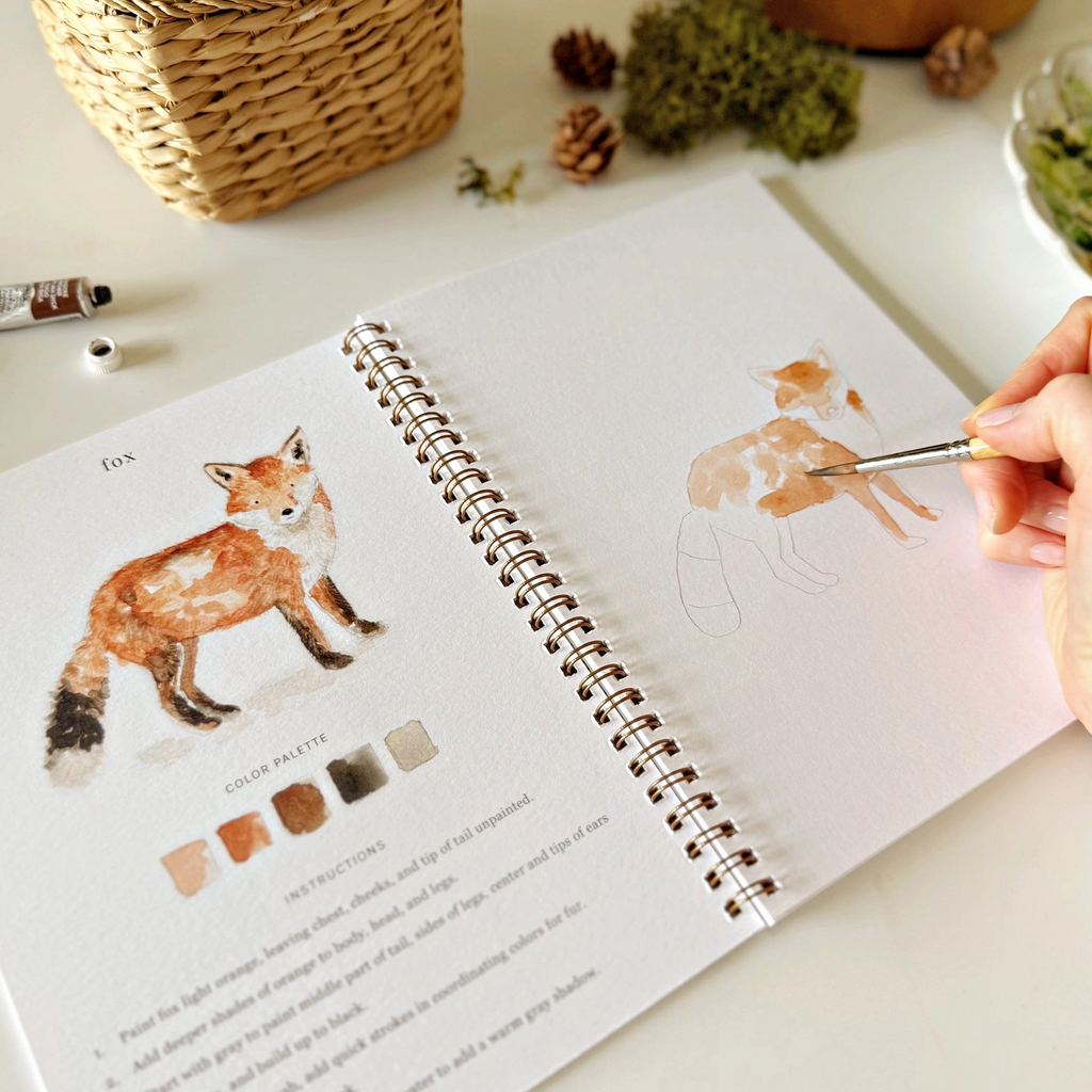 12 different woodland-themed illustrations with an example of the finished painting, step-by-step instructions, and a lightly illustrated sketch for you to paint. It's just like a coloring book, but with watercolor! Enjoy this peaceful painting hobby on your own, with children, or with friends. Makes a wonderful gift and is perfect for artists of any age.