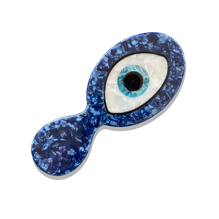 Fabulous hair brushes made of individually cut cellulose acetate pieces, an eco-friendly, biodegradable material made from recycled wood pulp. They are hand-painted and feature the iconic evil eye design.