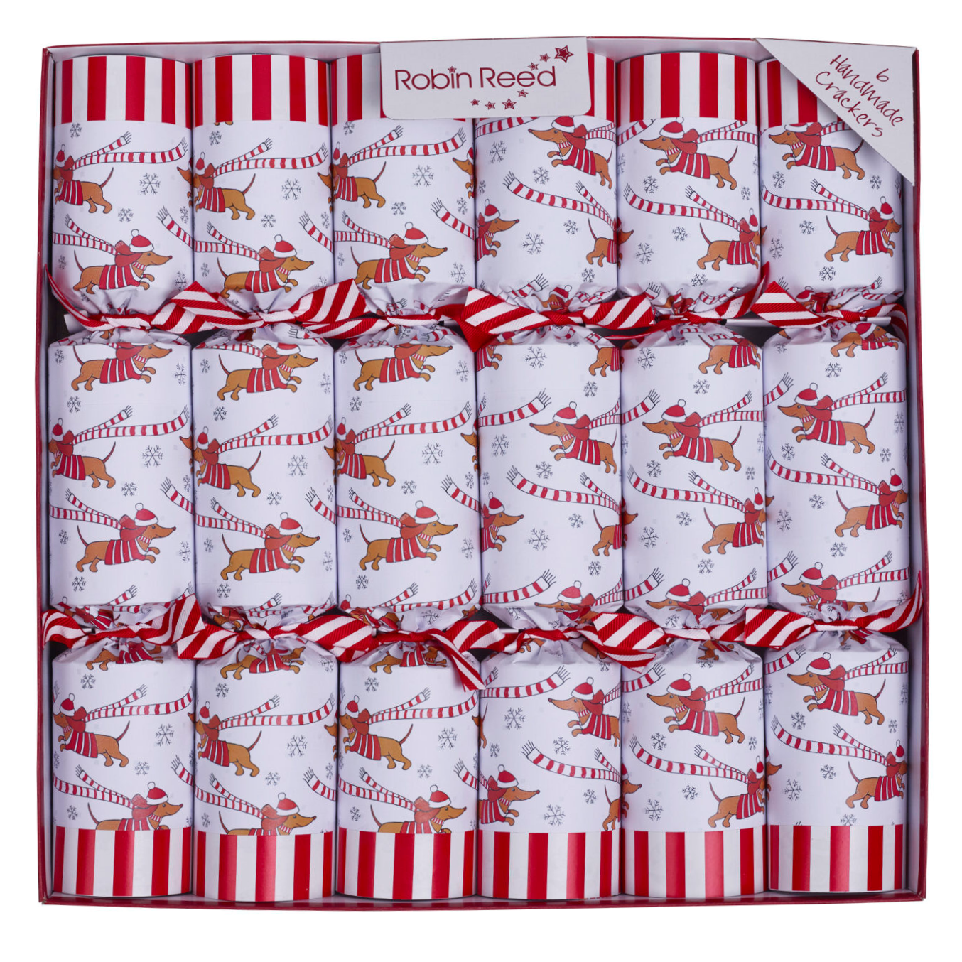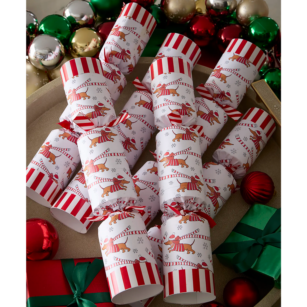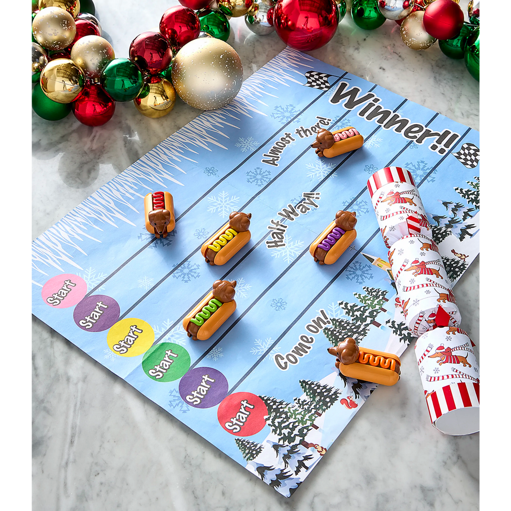 Holiday party fun! The set includes a race track and red & white crackers, each containing a wind-up toy sausage dog. Wind them up, line them up and see who wins. The crackers will pop and also include a joke and a party hat.