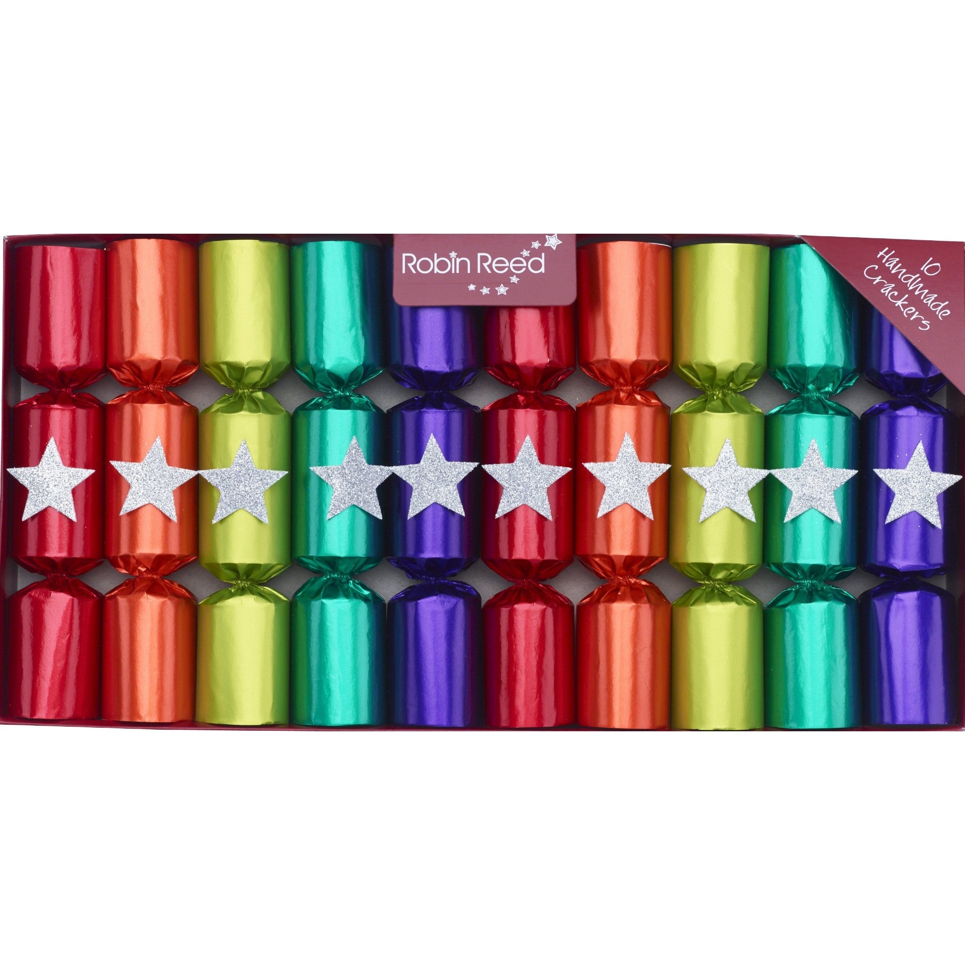 Set of 10 super bright handrolled foiled paper crackers, each with a glittered silver star. Filled with a crown, a joke and a small trinket.