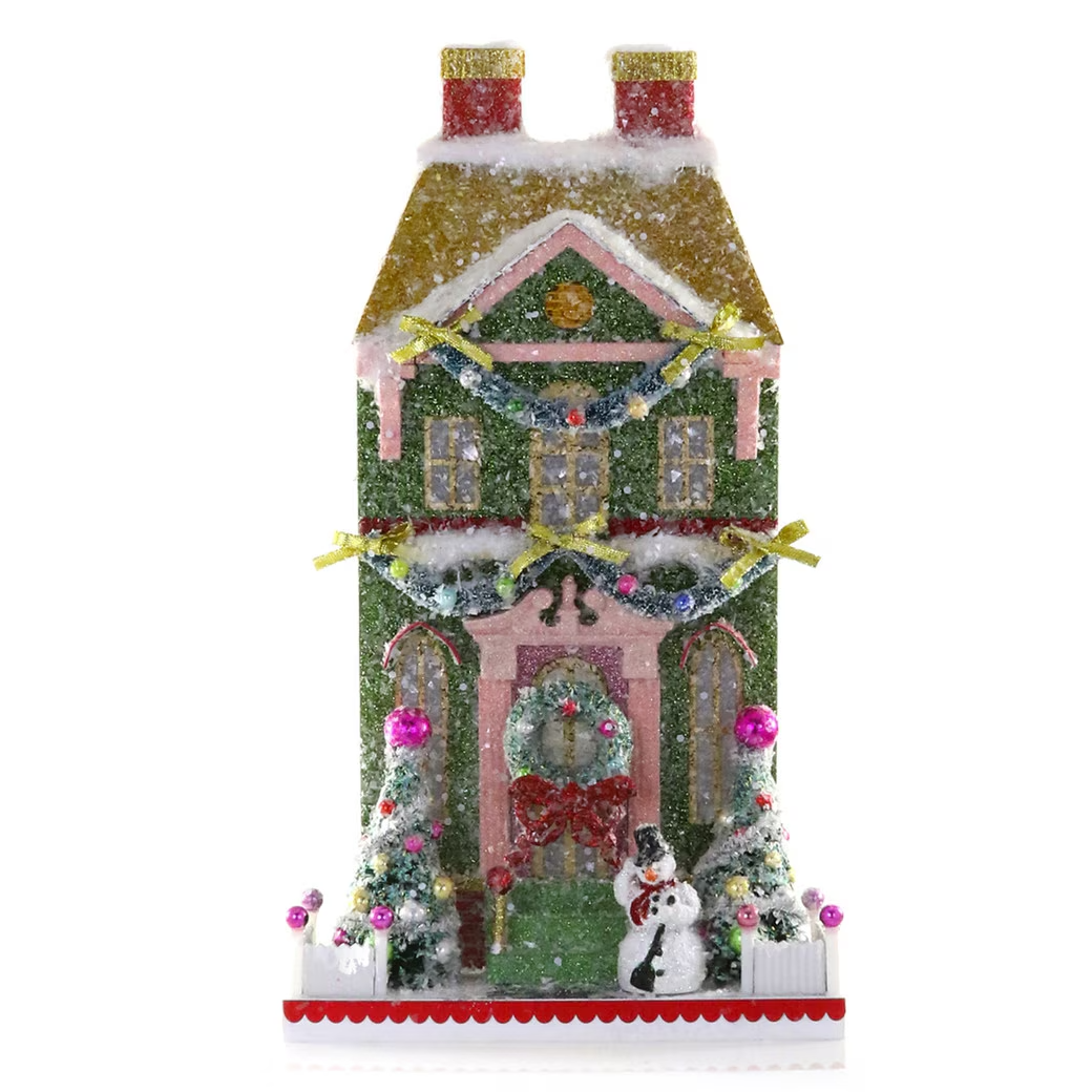 A jolly glittered snowman is the keeper of this glorious green and pink townhome, all decked out for the holidays and covered in sparkly glitter.