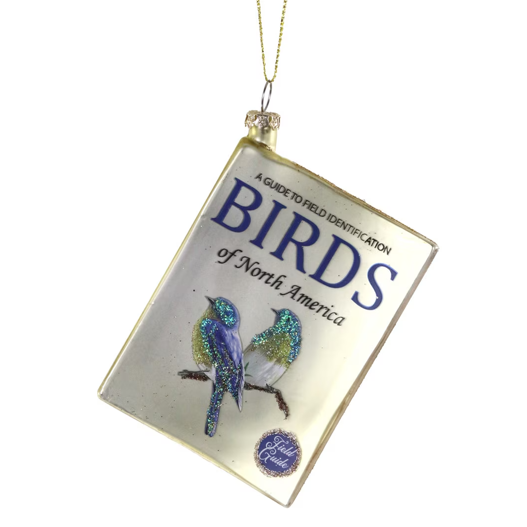Two pretty bluebirds grace the cover of this glittered glass field guide to birds -- the perfect ornament for birders.