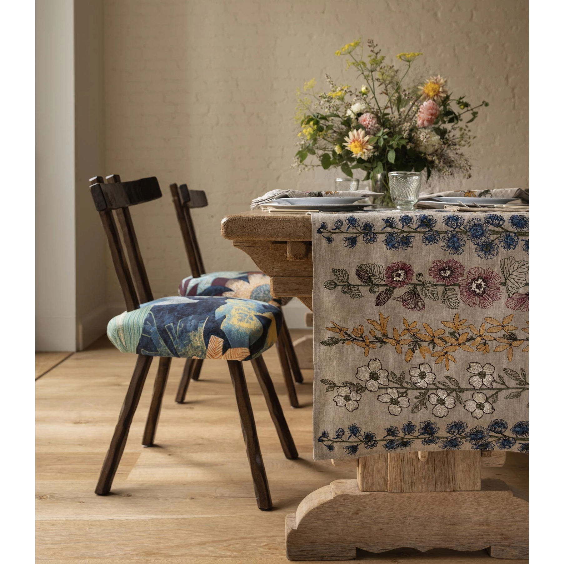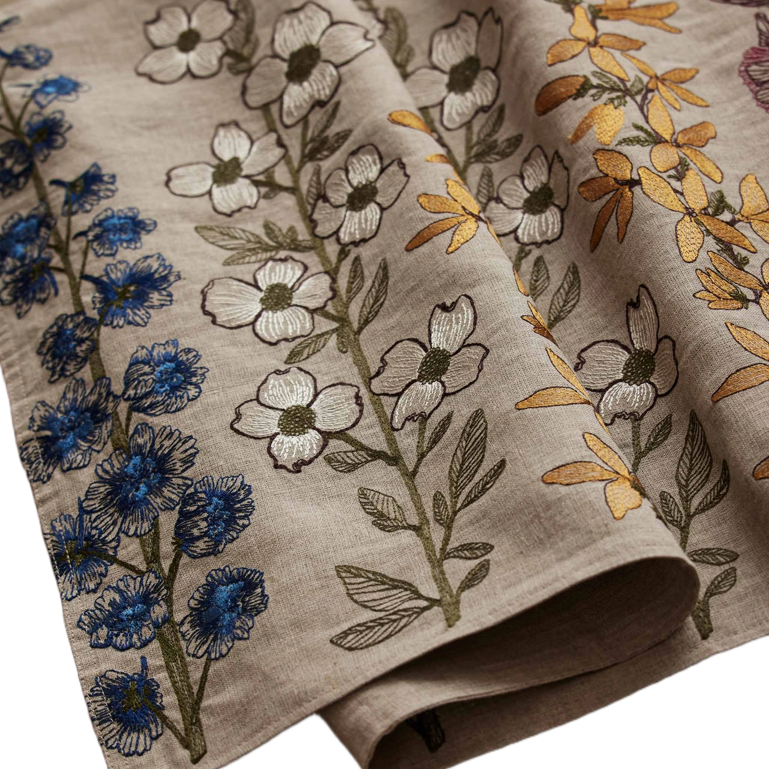 Celebrate spring and summer with Coral & Tusk's floral table runners. Delphinium stems, dogwood and forsythia branches, and freshly cut hollyhock flowers are embroidered in great detail creating a garden of beauty and inspiration.  Embroidered on 100% linen with linen backing. Unbleached, undyed, and Oeko-Tex Standard 100 certified.