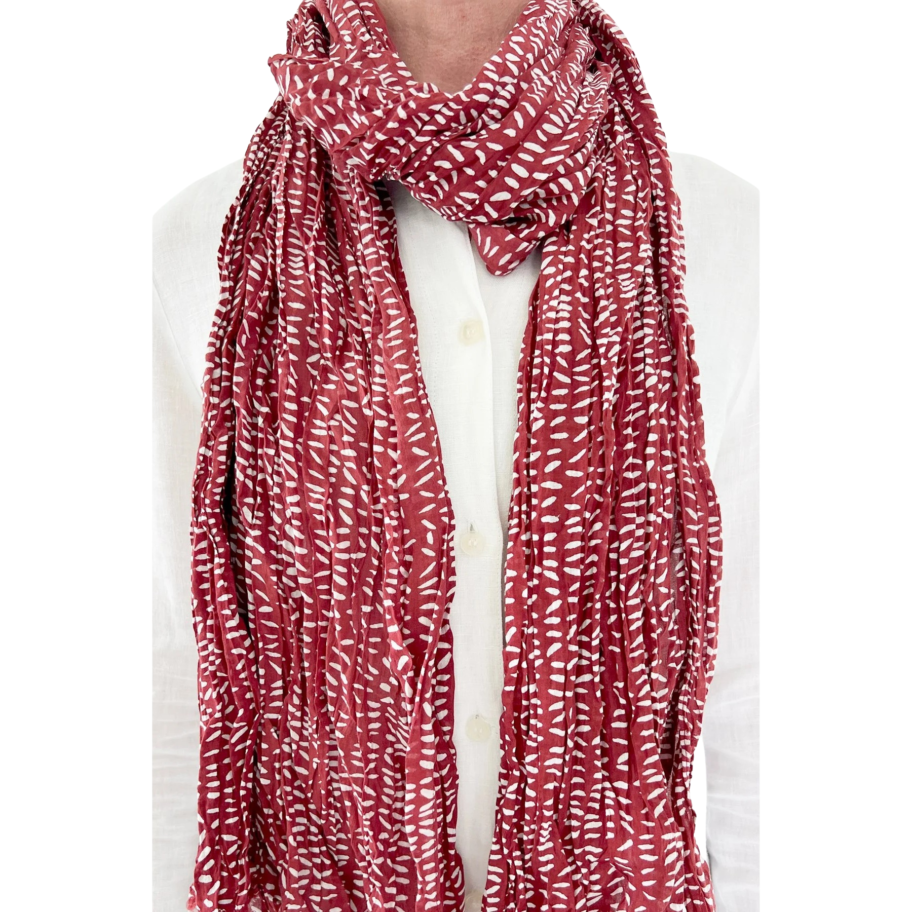 Soft, lightweight cotton scarves are an easy way to add a splash of color and this terracotta and white makes the case.