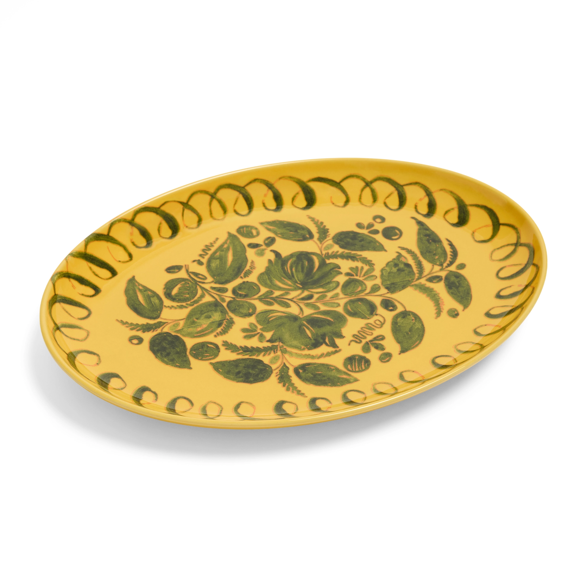 Capacious oval tray will make a wonderful addition to your table ware. Inspired by the bounty of the Mediterranean in mustard with dark olive hand-painted motif.