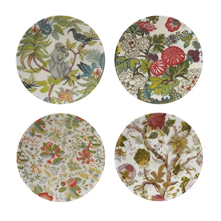 Four colorful chintz patterns, inspired by vintage upholstery textiles. They are printed on stoneware and perfect for breakfast, lunch, salads or desserts. Sold assorted as shown.
