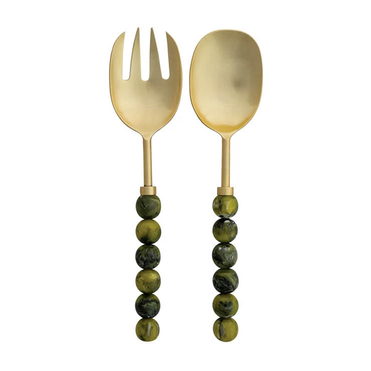 A stack of mottled green ball beads create the handles of these gold-finished stainless steel salad servers. Set 2, fork and spoon.