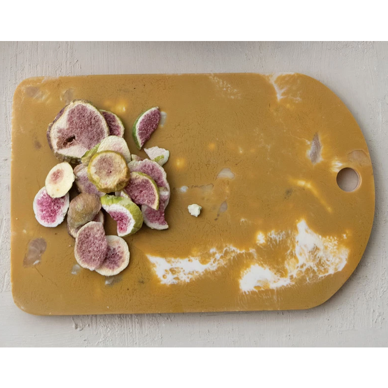 Marbled caramel and white resin serving board makes cheese and appetizers look amazing. Fingerhole provides an easy place to hang this board.