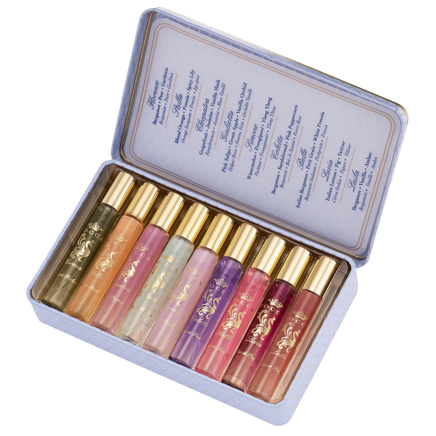 Nine classic Tocca scents, each with her own distinct character. The 4.5ml Eau de Parfum spray vials are perfect for travel, to bring along in your handbag, or to wear on rotation for a daily dose of indulgence. Packaged in a precious Tocca tin. Endlessly covetable, incredibly giftable.