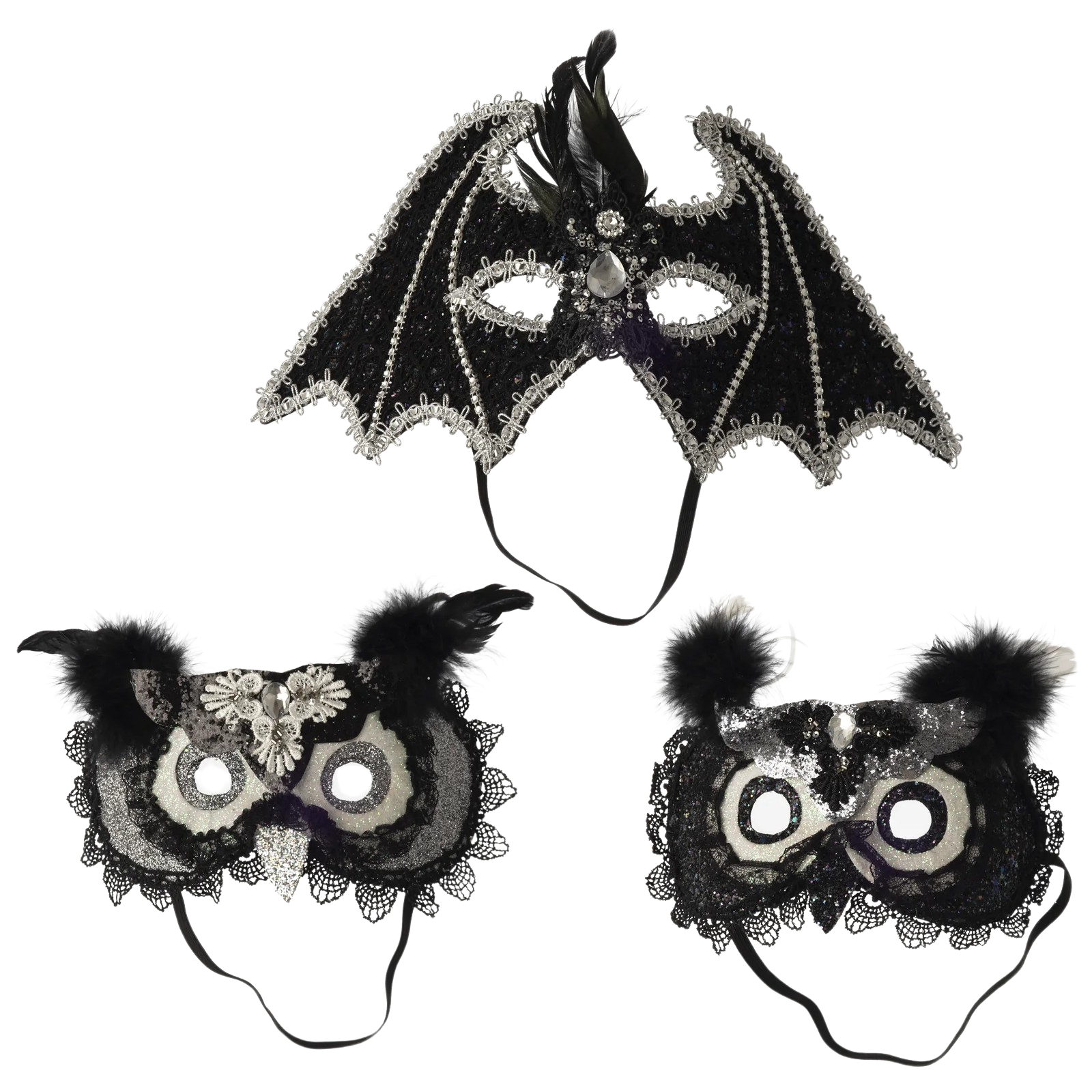 Choose any one of these three elaborate black masks, embellished with lace, glitter, feathers, beads and glitter in black and silver.