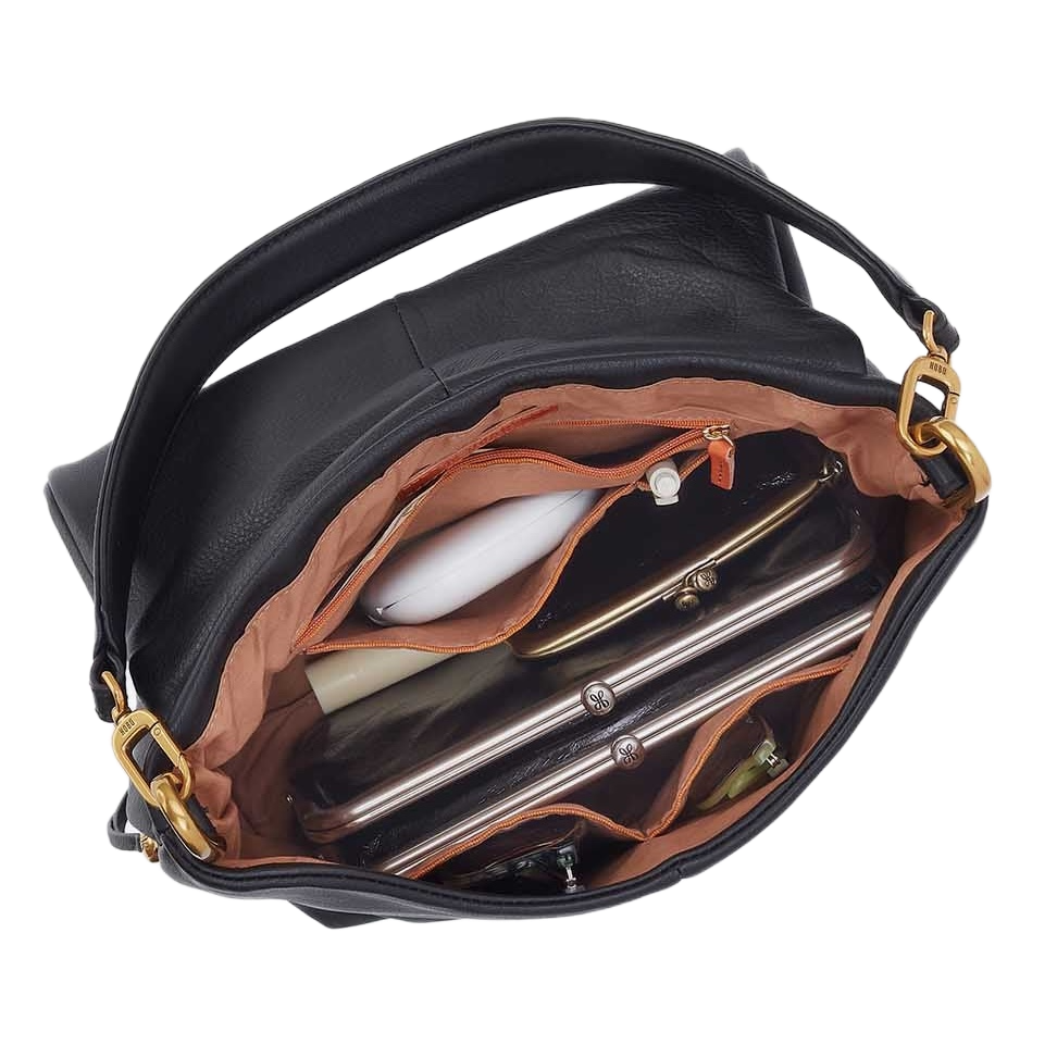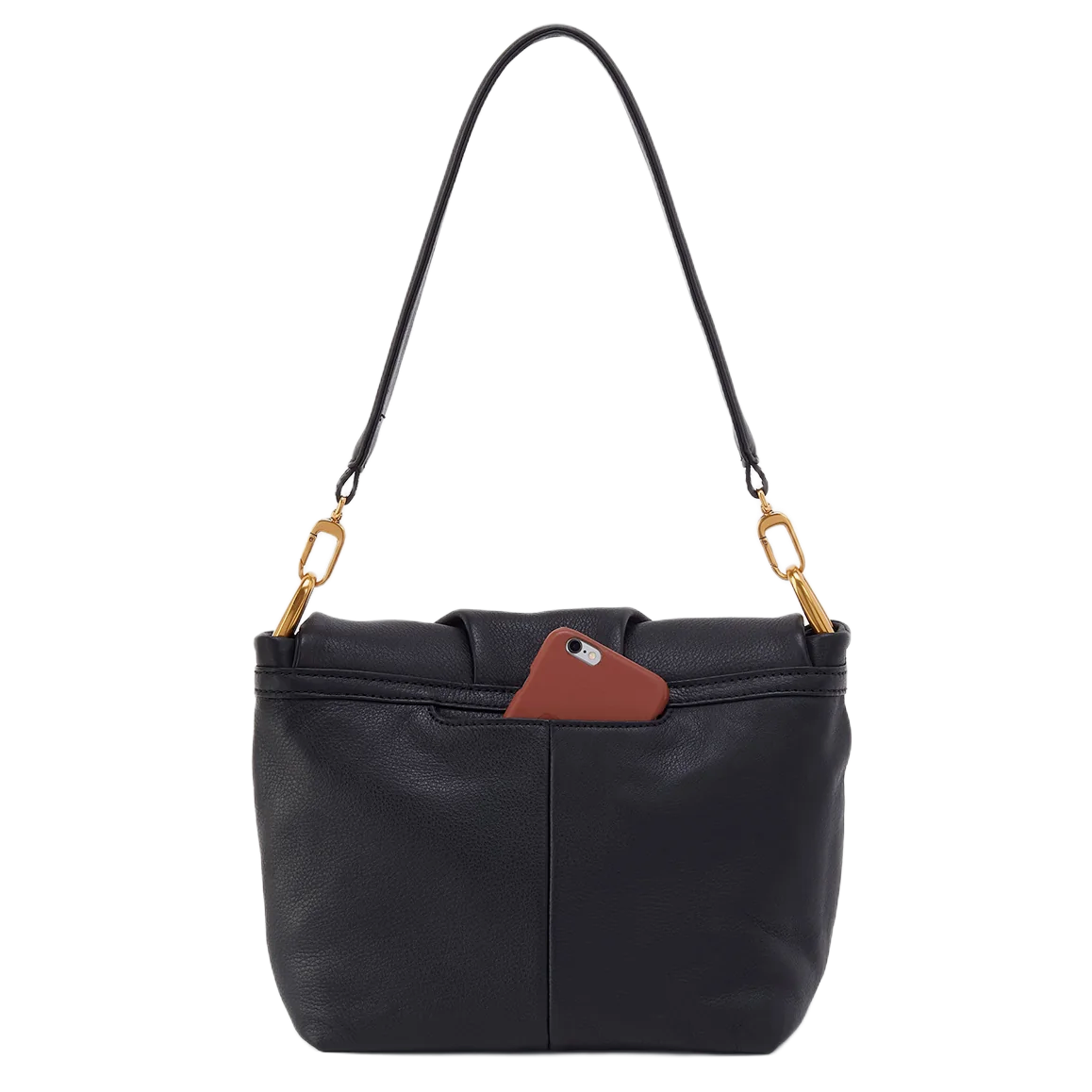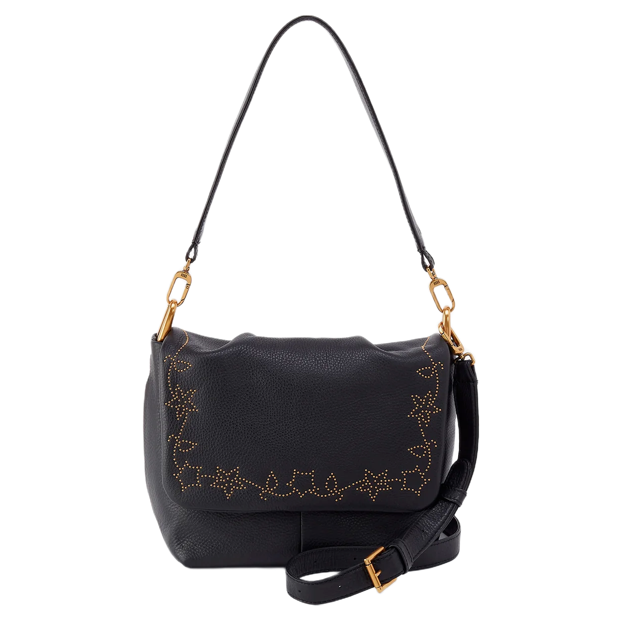 Soft, slouchy pebble leather in a black with brass studs, converts from a shoulder bag to a crossbody with the removable strap. Plus you'll find plenty of functional details.