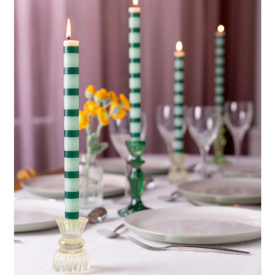 Add a festive pop to holiday tables with these green on green striped dinner candles. Featuring a tapered silhouette and a fresh candy stripe design, they bring a playful yet classic look to Christmas, winter entertaining. Unscented.