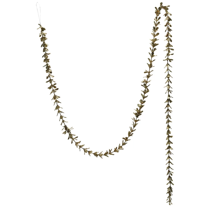A pretty trailing vine of faux boxwood leaves, covered in gold glitter and ready to sparkle up your holiday decor.