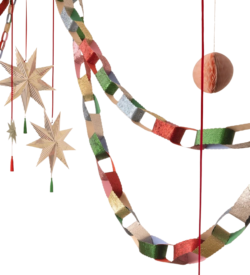 • 24 paper chains in 6 jewel-like colors of red, gold, green, blue, pink and silver