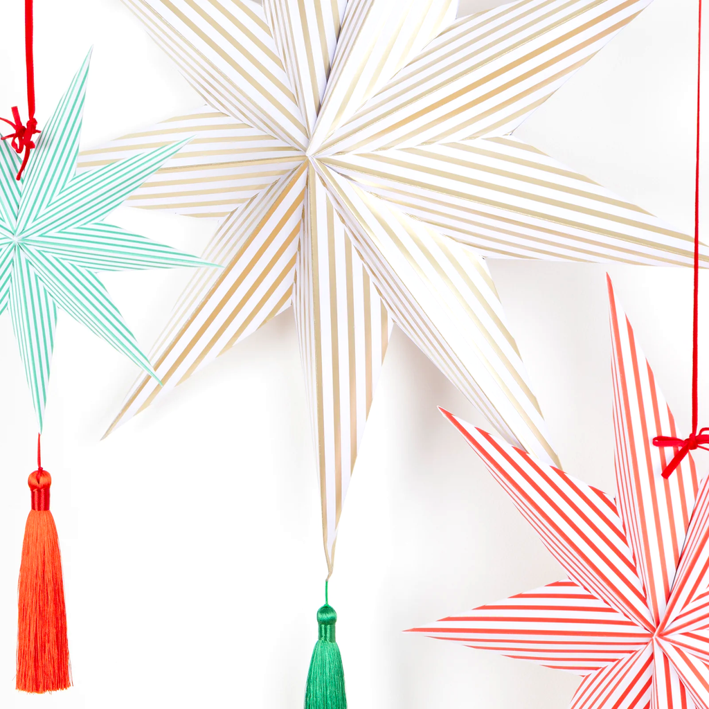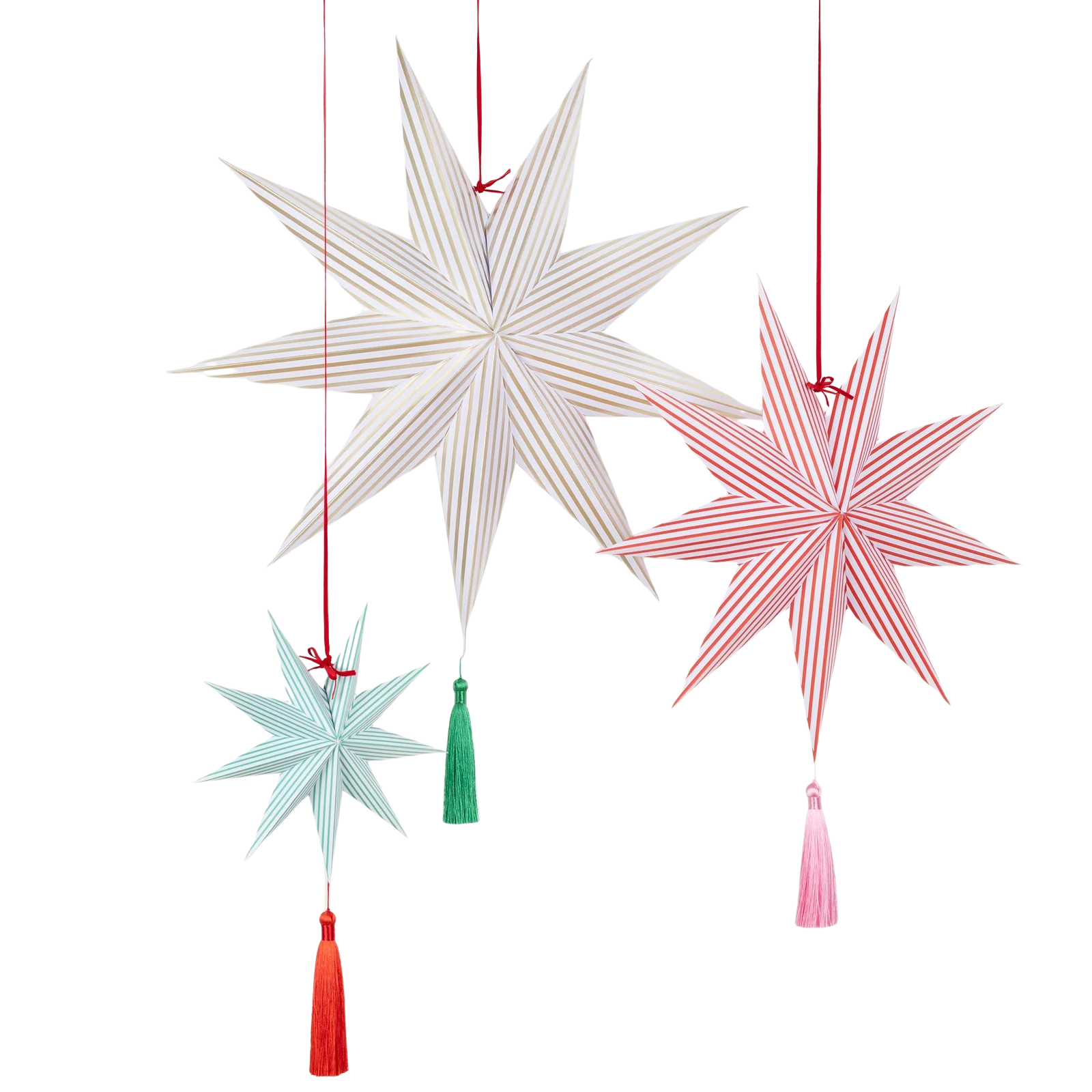 Stripes in traditional festive tones team beautifully with bright statement tassels and luxurious red velvet ribbons. Perfect to hang in a porch or window, or from the ceiling, for a vibrant look. Team together, or place separately, to achieve the effect you want. Reusable, bring them out every year for seasonal cheer and elegance. Set of 3, simple self assembly required.