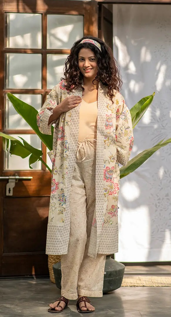100% lightweight cotton, hand block printed, with pockets and self tie belt.