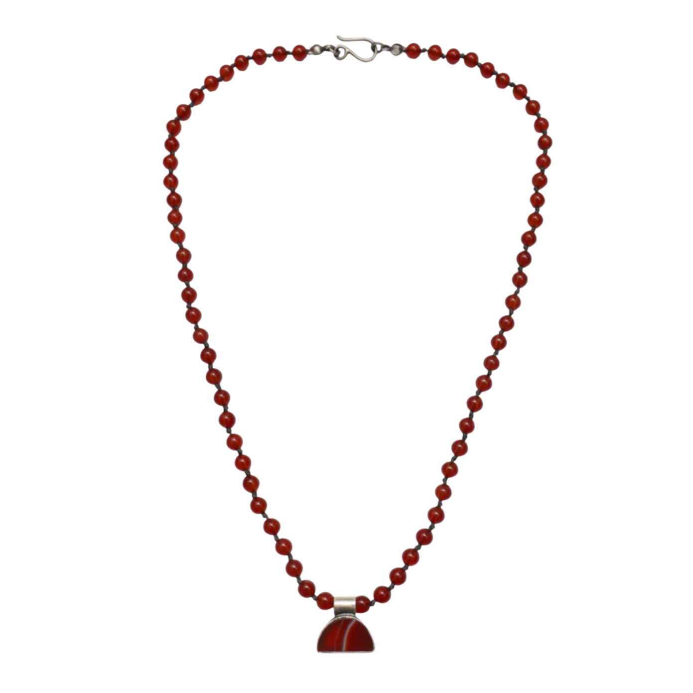 Luscious deep orange carnelians are hand-knotted and feature an arch-shaped cabochon carnelian set in sterling silver. By Jane Diaz.