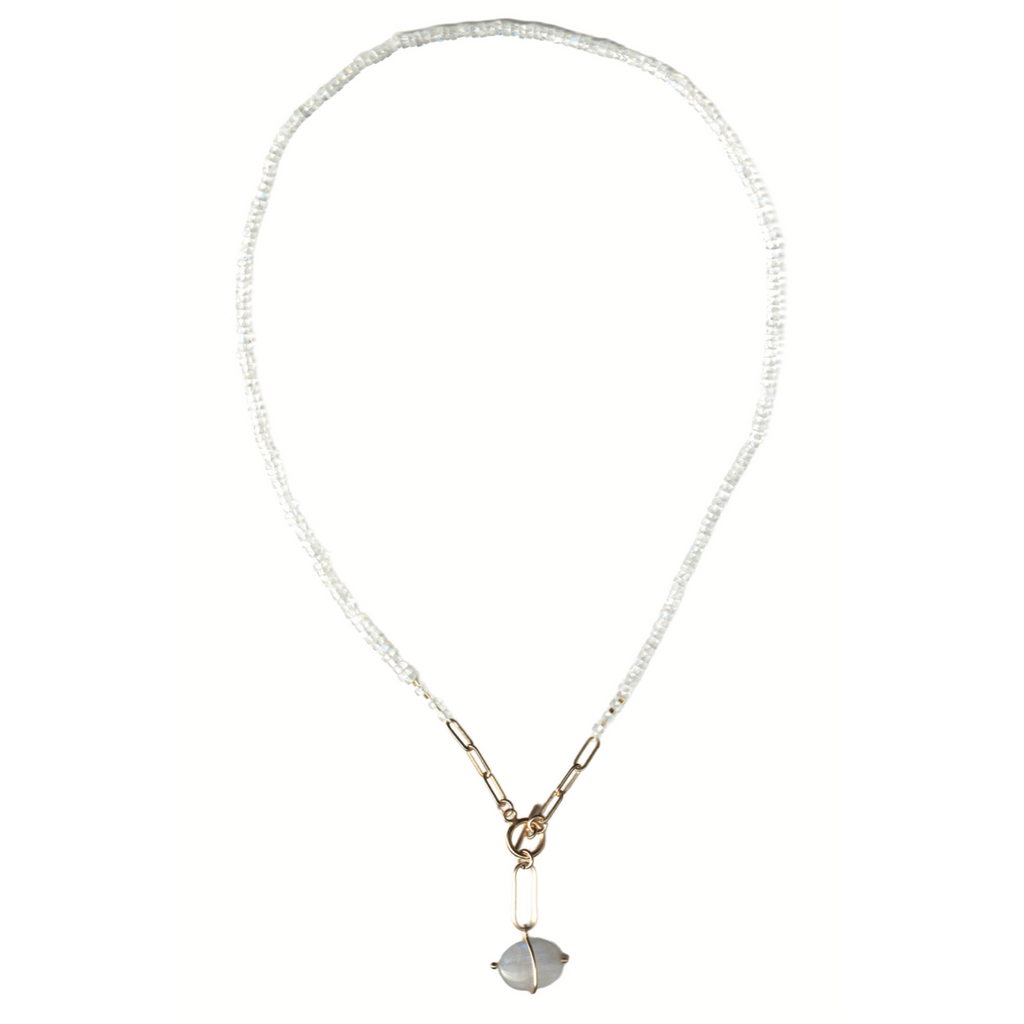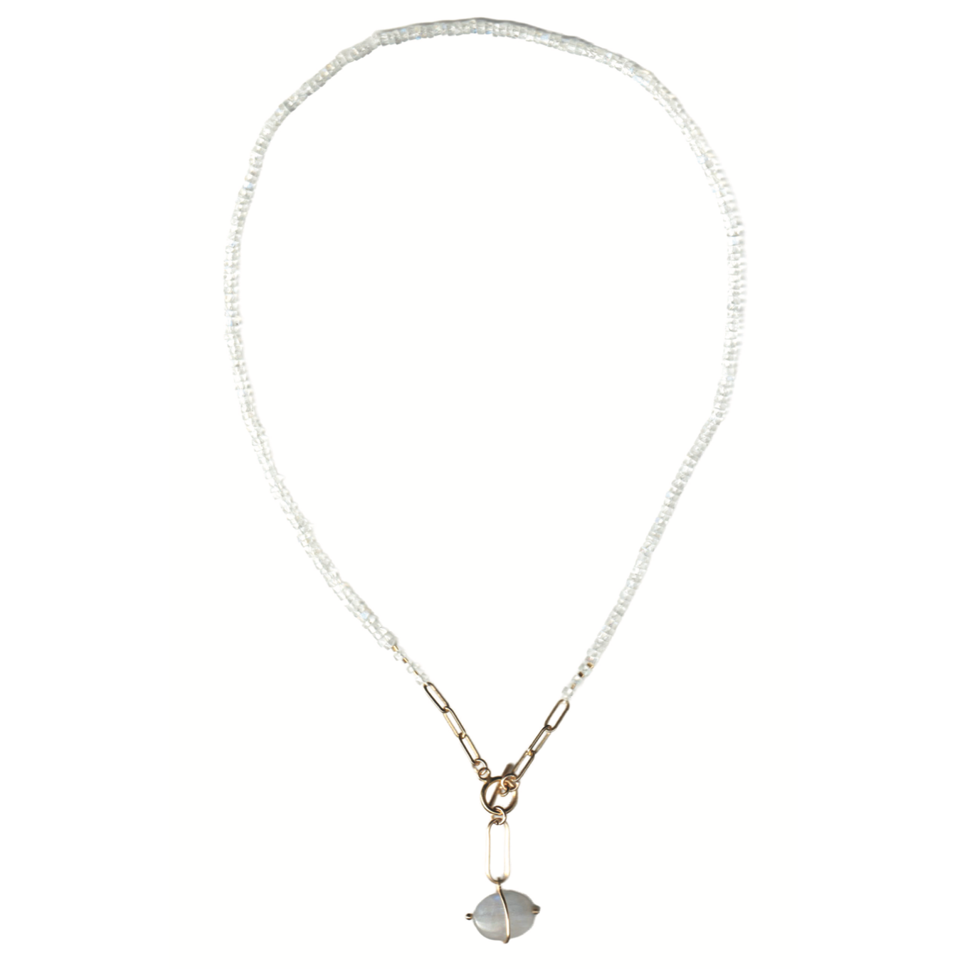 Dreamy oval cabochon moonstone, wrapped in goldfill and suspended from a toggle necklace of moonstone briolettes. By Iwona Ludyga