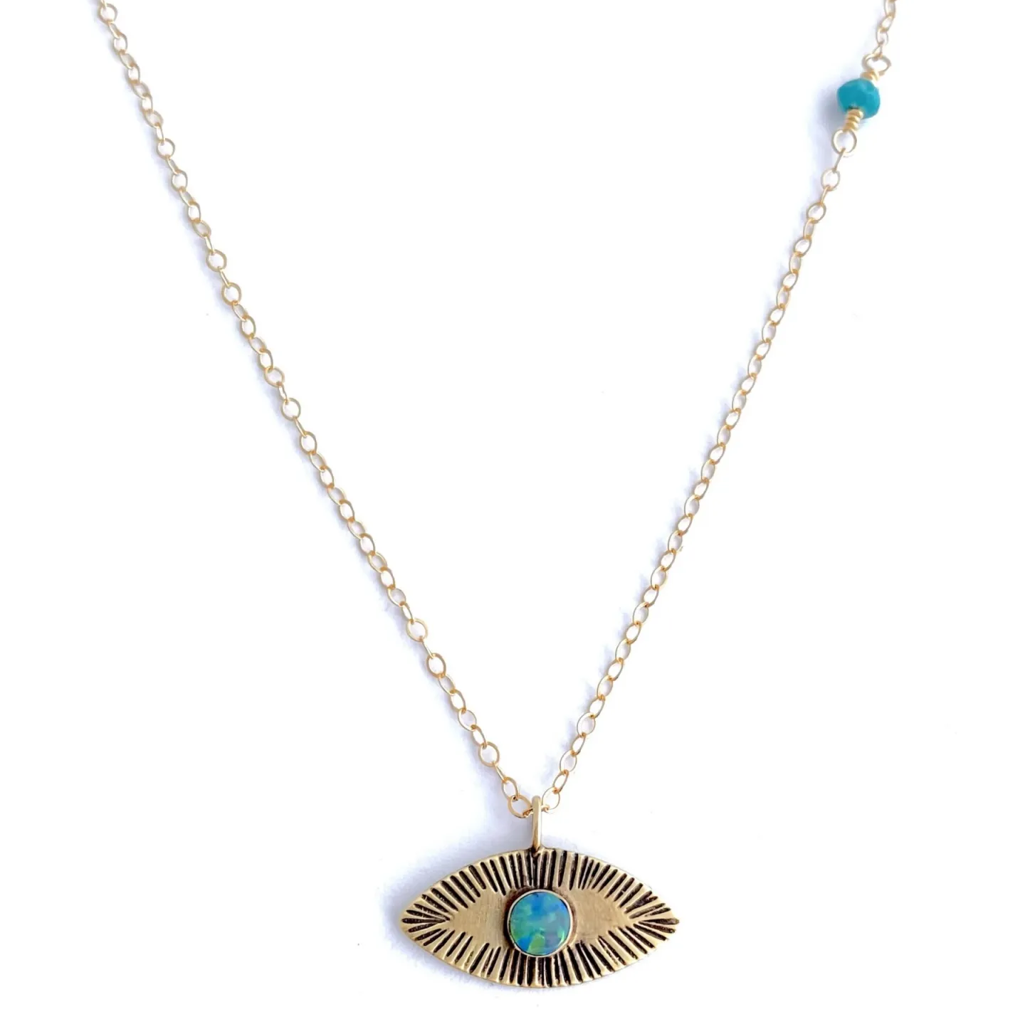 Mystical eye necklace, handmade of yellow bronze with hand stamped rays, set with a stunning 4 mm Opal Cabochon. The gold fill chain is offset with a Turquoise briolette.