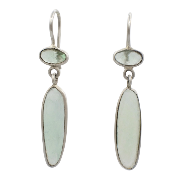 Long, lean faceted pale green apatites, set in sterling silver bezels.  Perfect imperfect organic shapes, no two exactly alike.