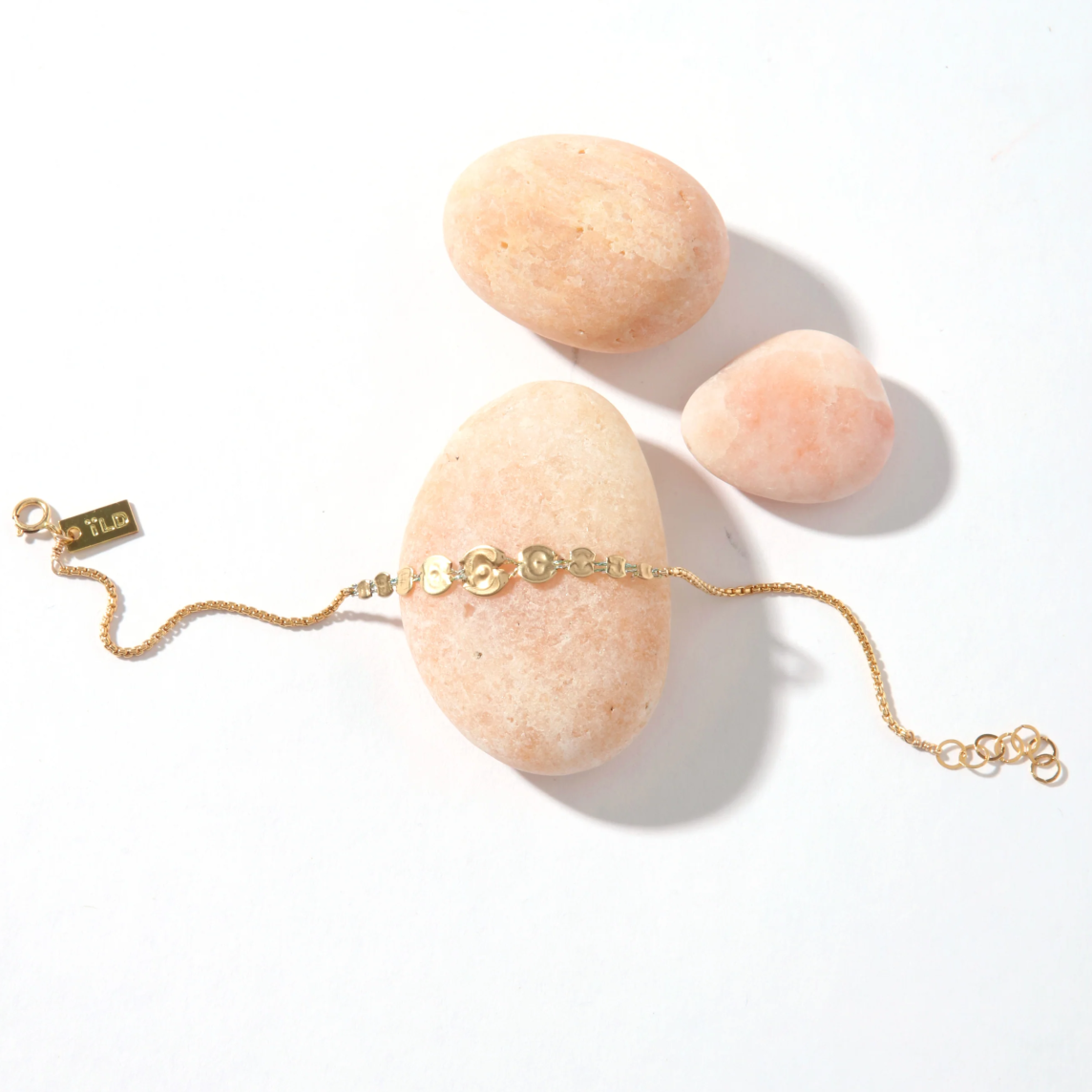 The phases of the moon spelled out in an abstract fashion on a thickish goldfill chain bracelet. By Iwona Ludyga