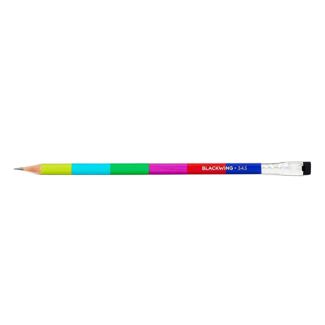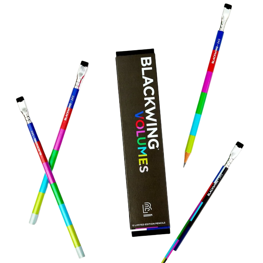 The newest Volumes release! Blackwing 343 is a tribute to broadcast television. Each pencil features a color bar finish inspired by the NTSC test pattern, and extra-firm graphite. The model number 343, a reference to the 343 scanlines on early CRT televisions, is imprinted with a “TV snow” silver holographic foil.