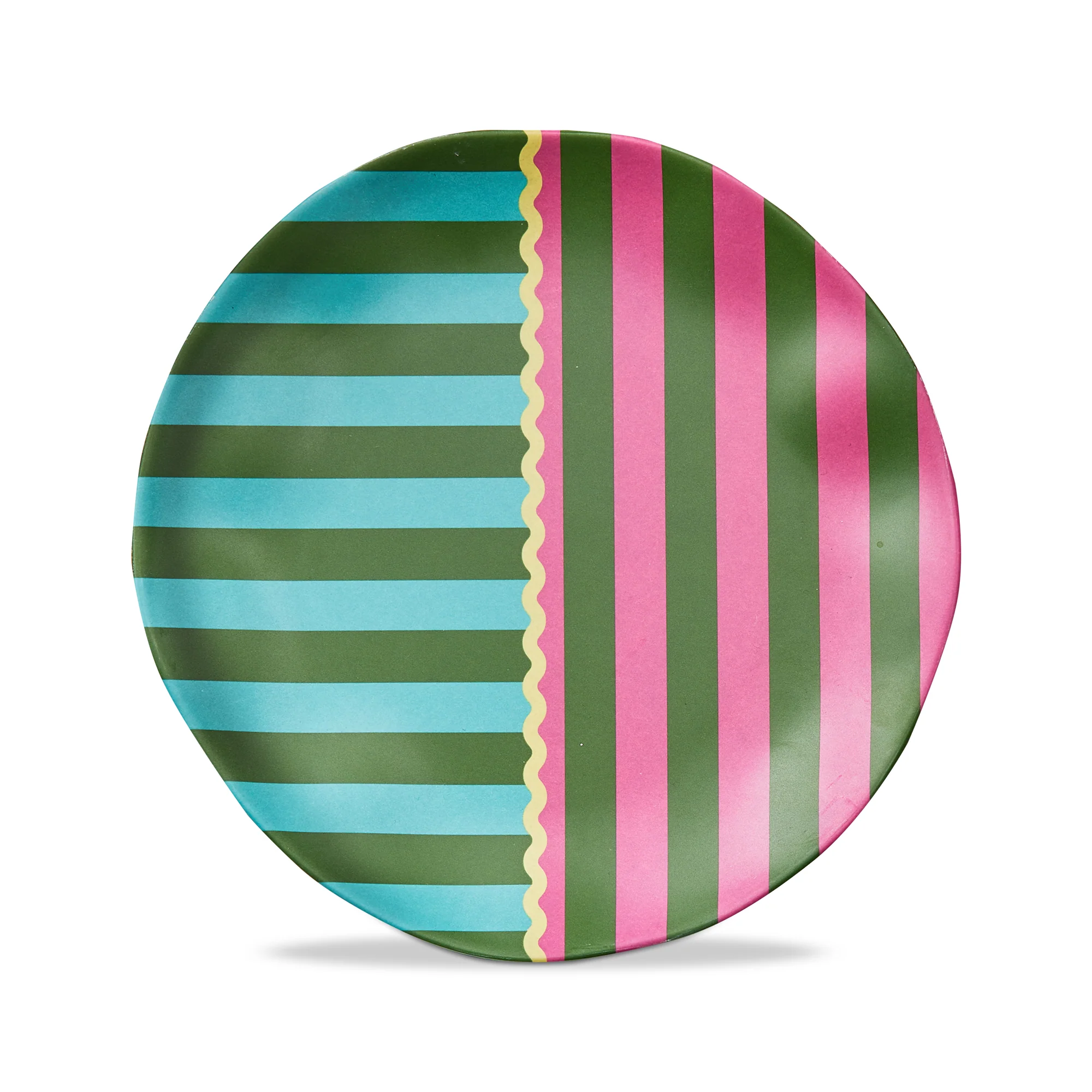 Modern and fun. Organic shapes in matte finished green, blue and pink offset stripes offer the look of ceramic with added durability. This size if perfect for breakfast, lunch or appetizers. BPA-free shatterproof melamine.