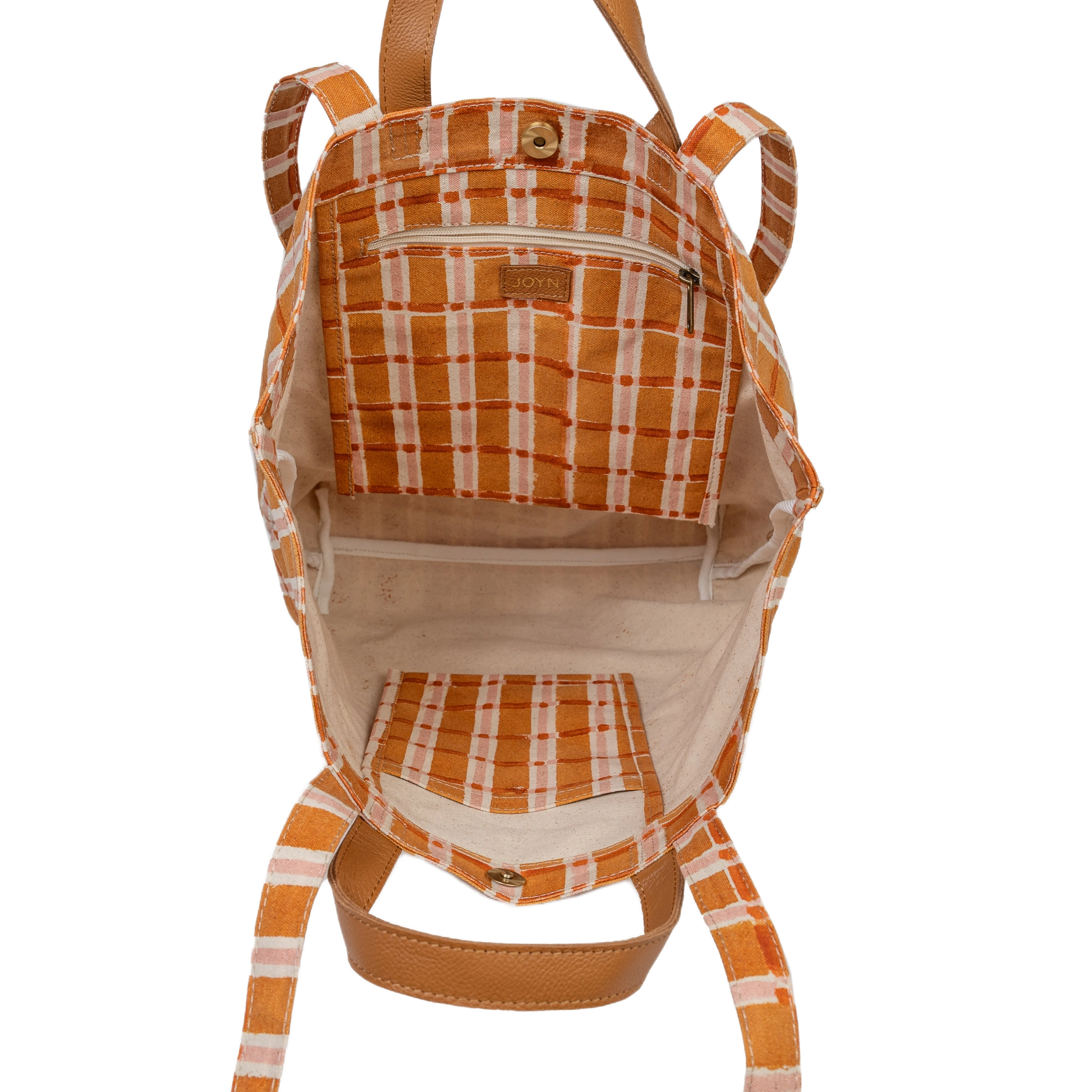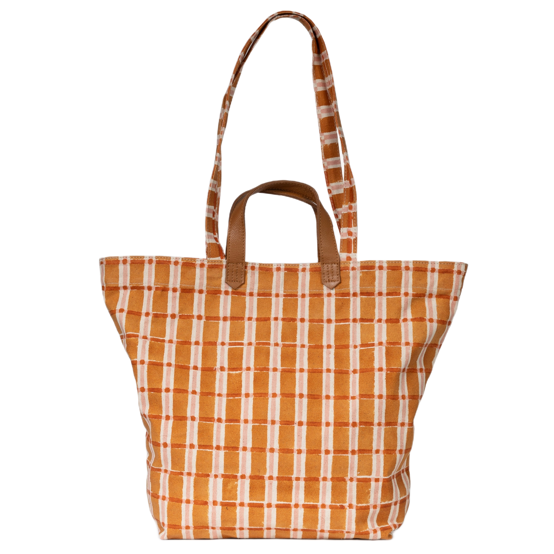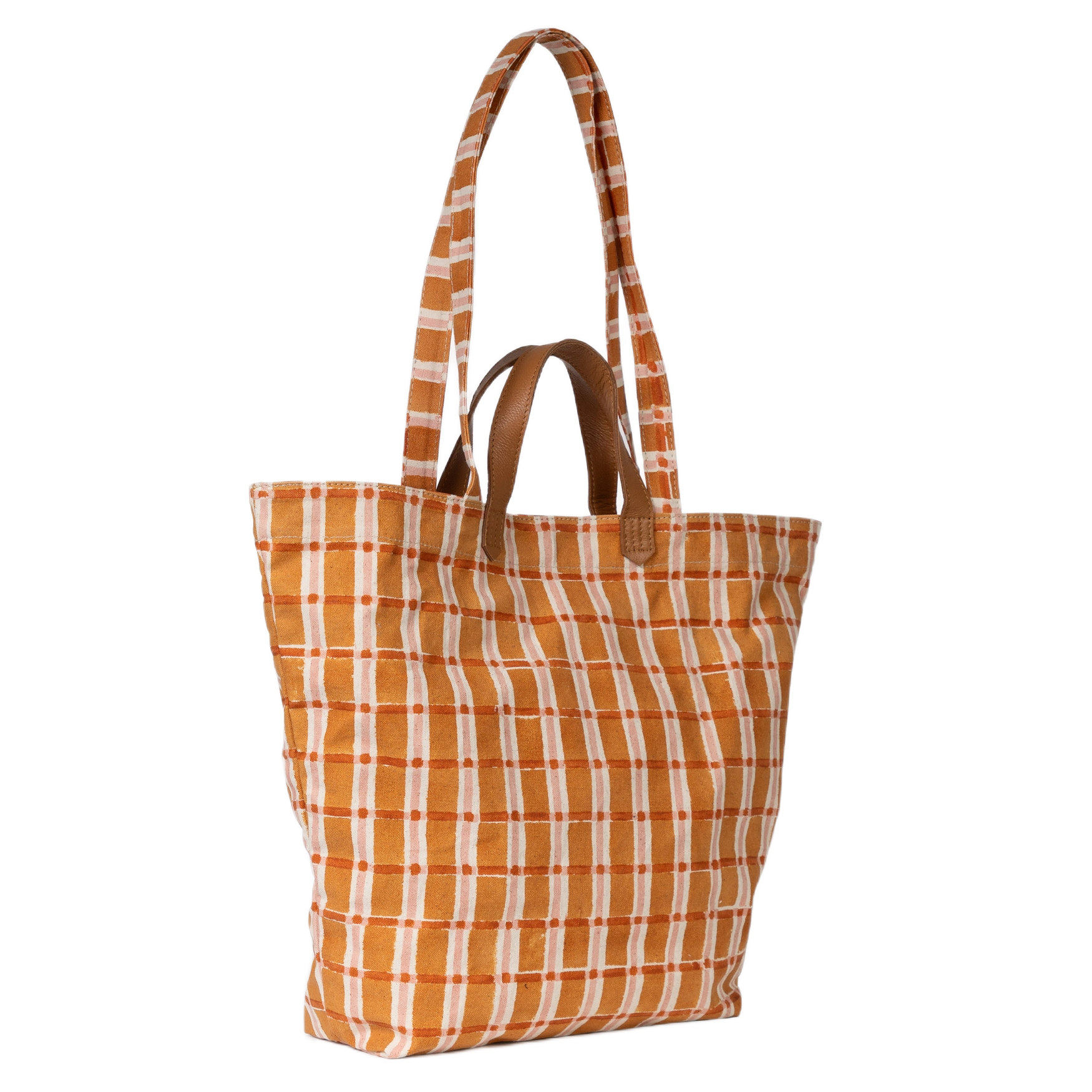 An elevated, capacious everyday tote that's perfectly practical with two ways to wear. Carry by hand using the recycled leather straps or over the shoulder thanks to the comfortable, canvas straps. Hand block printed on heavy, handwoven cotton canvas.