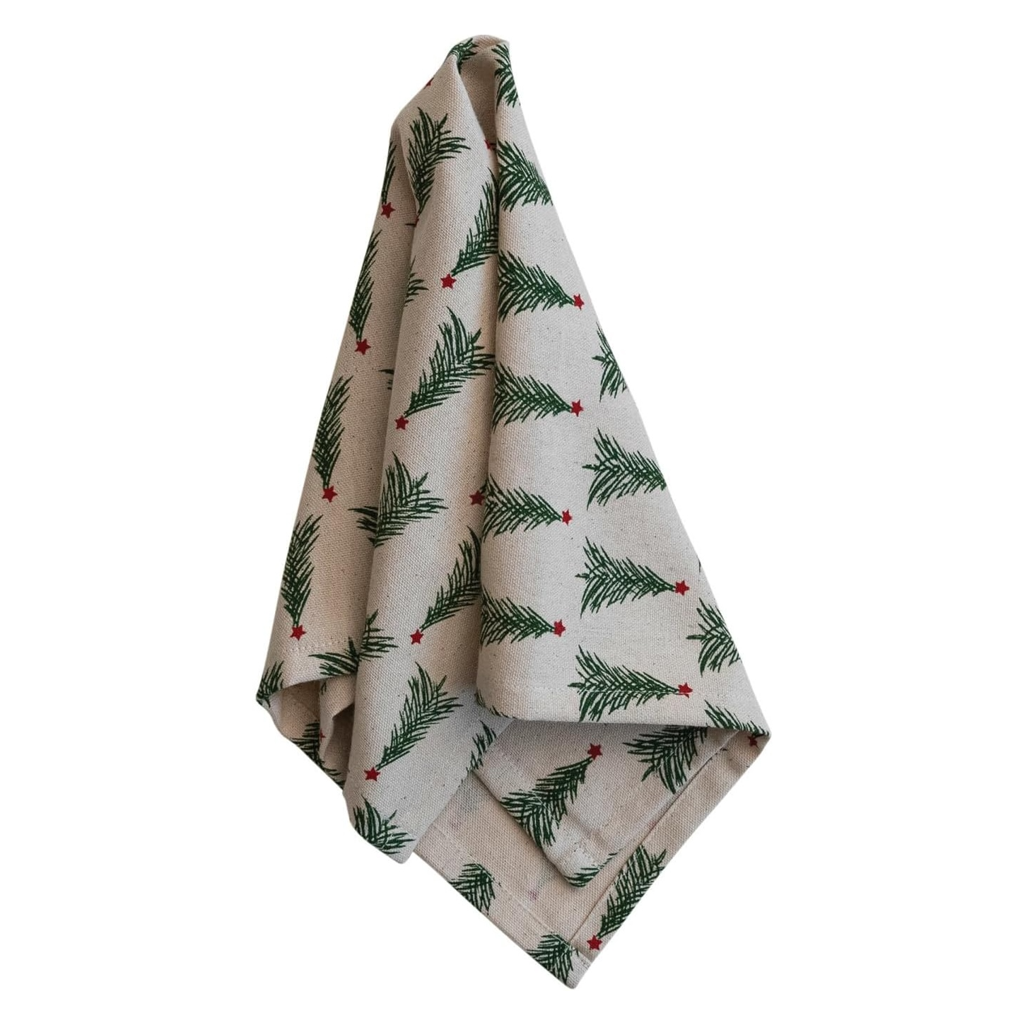 Natural, 100% cotton napkins printed overall with cheerful green trees, topped with red stars.