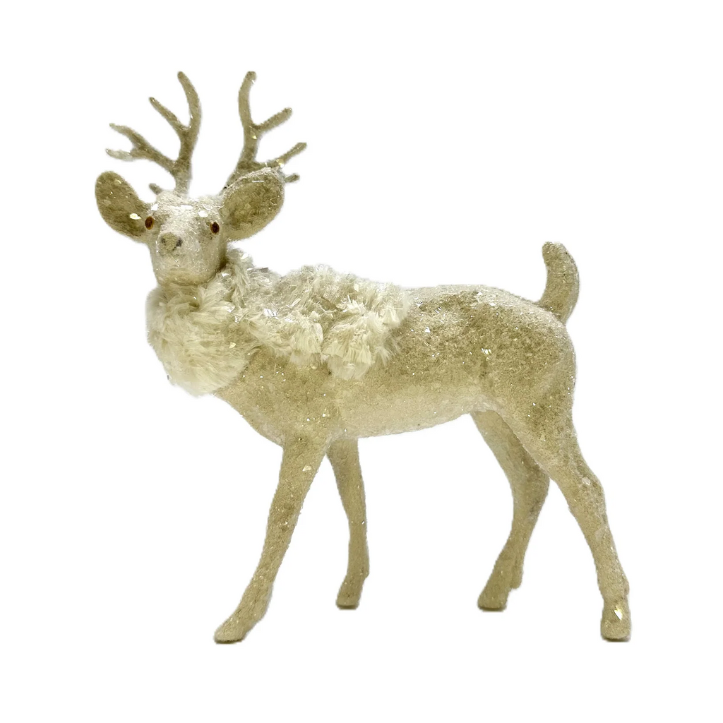 Meet our dazzling Comet deer, sporting a luscious cream-colored coat that shimmers with the brilliance of light-reflecting glass glitter. This majestic creature flaunts a chic bisque faux-fur scarf, sprinkled with a delightful drizzle of icy glitter chips, and gold glittered antlers.