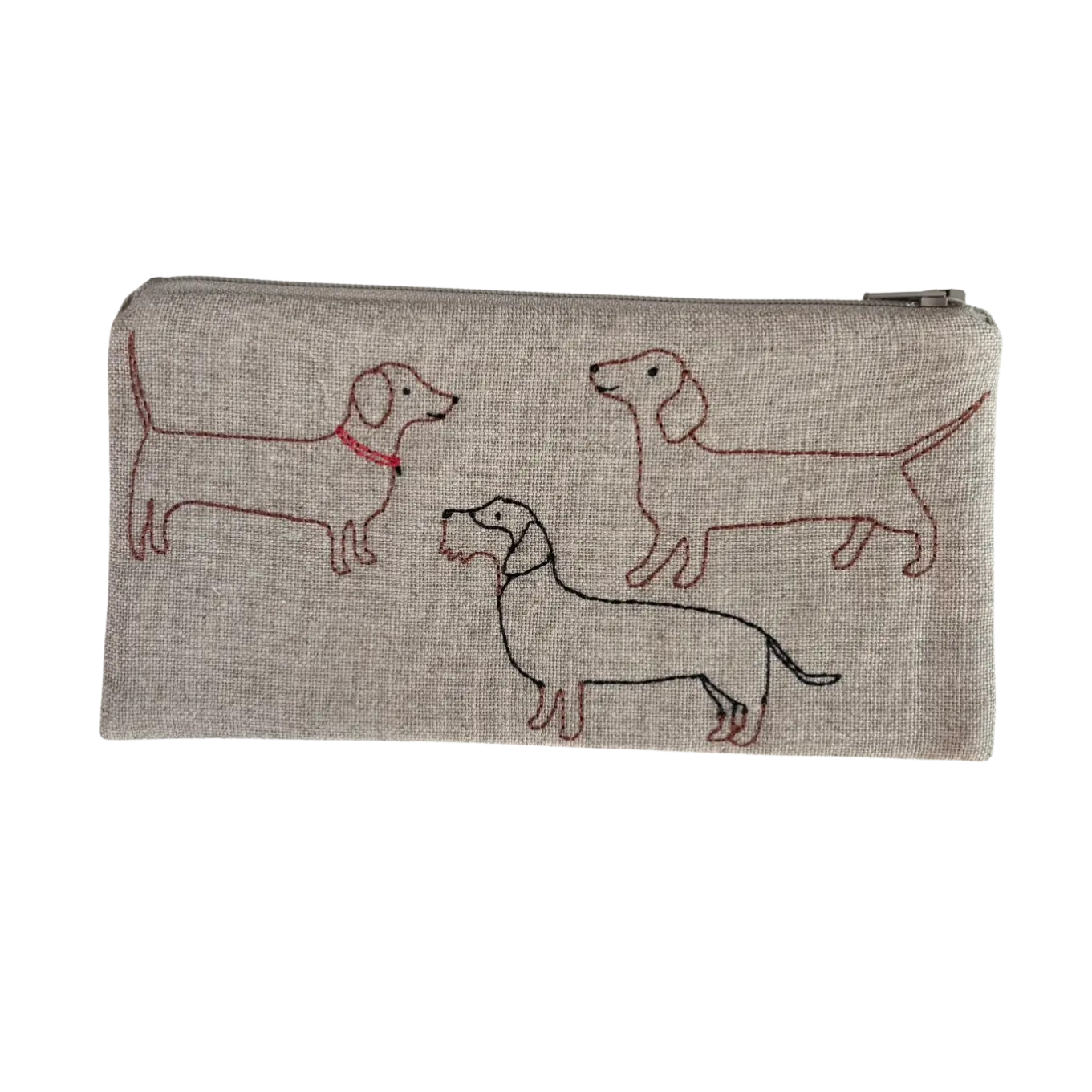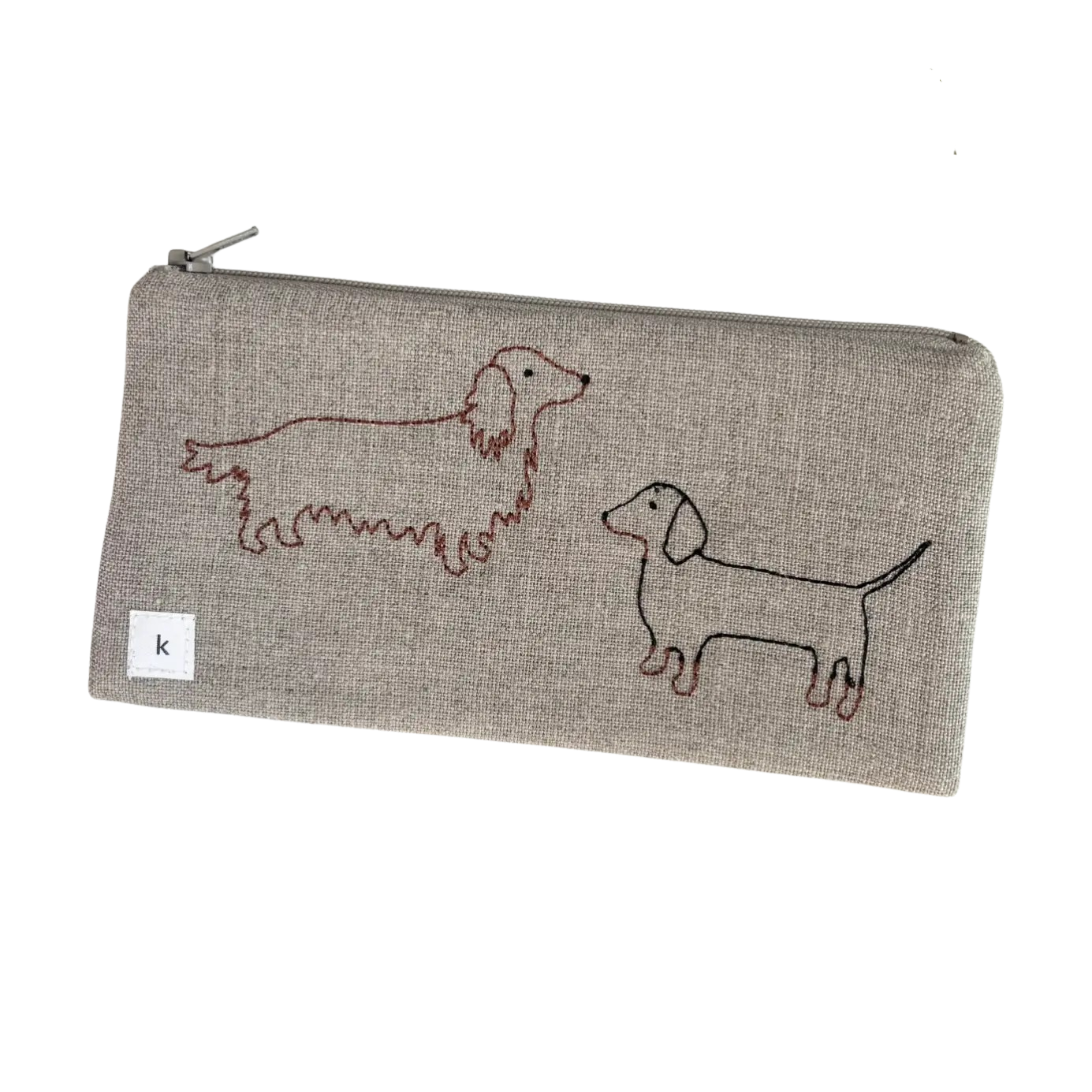 K Studio's Dachshunds in all varieties are embroidered on the front and back of these charming flax linen lined zip pouches.