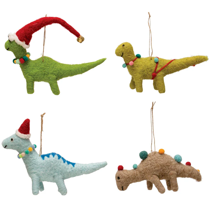 Adorable wool felt dinos, decked out with baubles and Santa hats, to delight a little one's Christmas tree. Sold assorted.