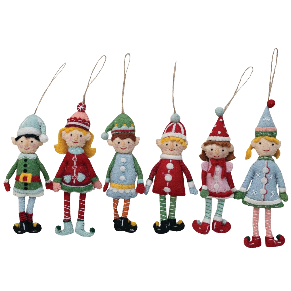 A family of elves dressed in colorful holiday attire, handmade of wool felt, here to bring joy. Sold assorted.