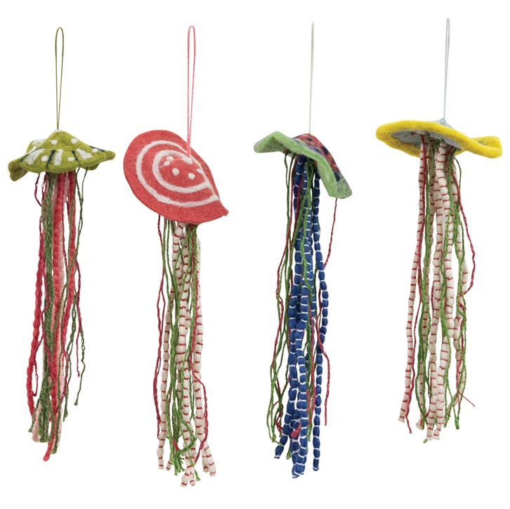 Colorful jellyfish handcrafted of wool felt and cotton brings sea life to your holiday decor. Sold assorted.