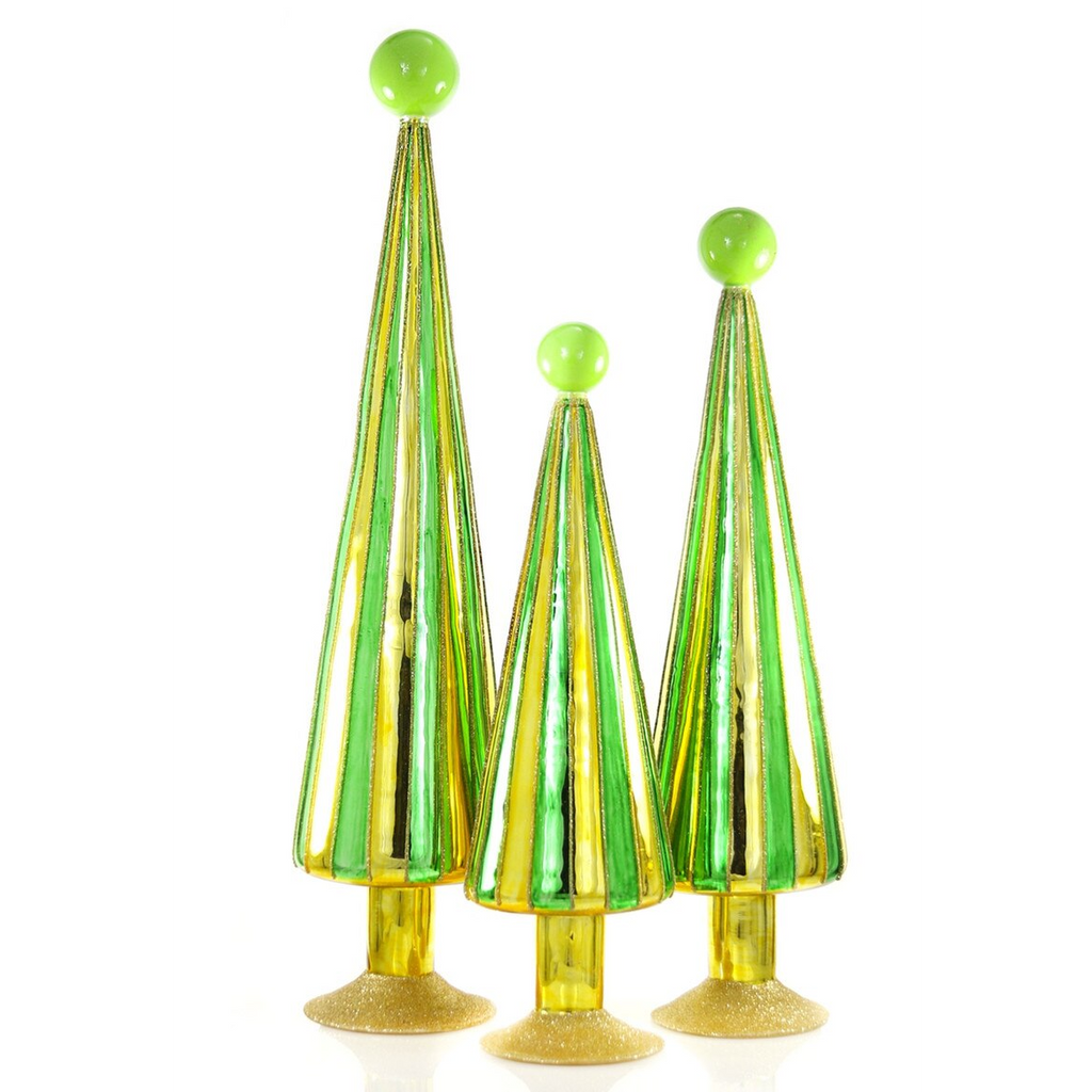 Artful handblown glass trees in gold and chartreuse stripes, limned with gold glittered and sitting on sparkly gold bases.