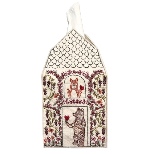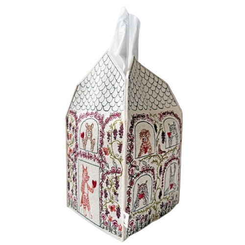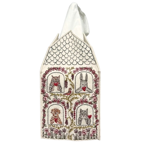 Fully embroidered on 100% linen, this sweet house is ready to disguise a boutique tissue box.