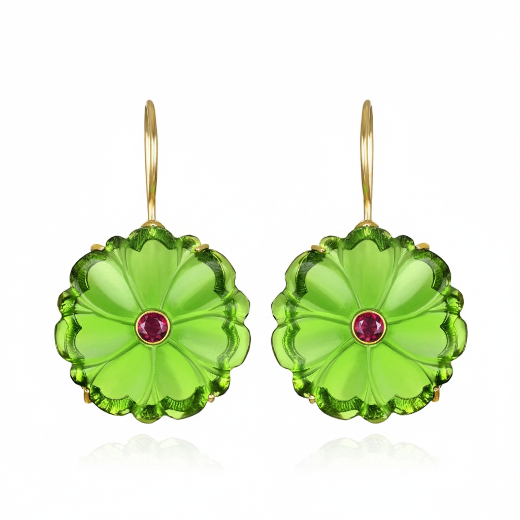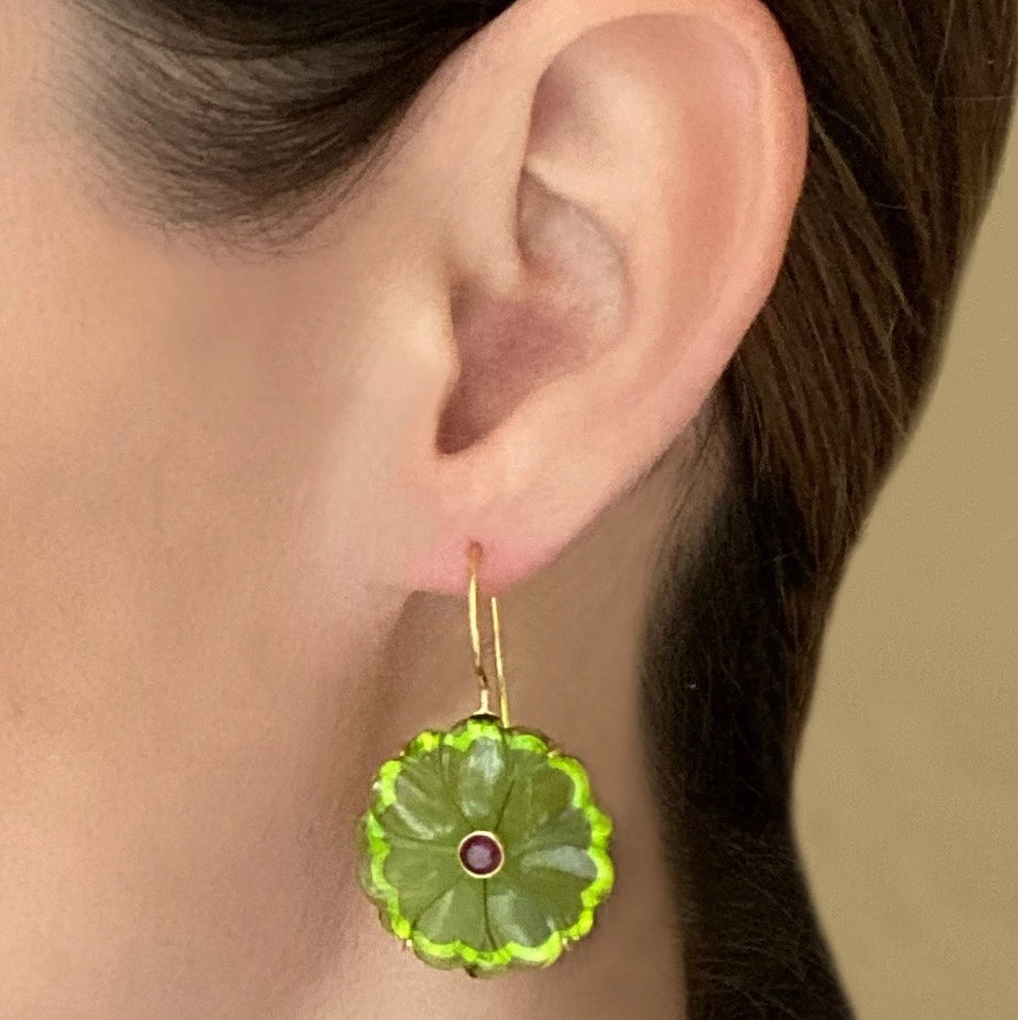 Hand-carved green quartz flowers set with sparkling bezel set garnet crystals, gracefully floating on 14k gold vermeil French ear wires.