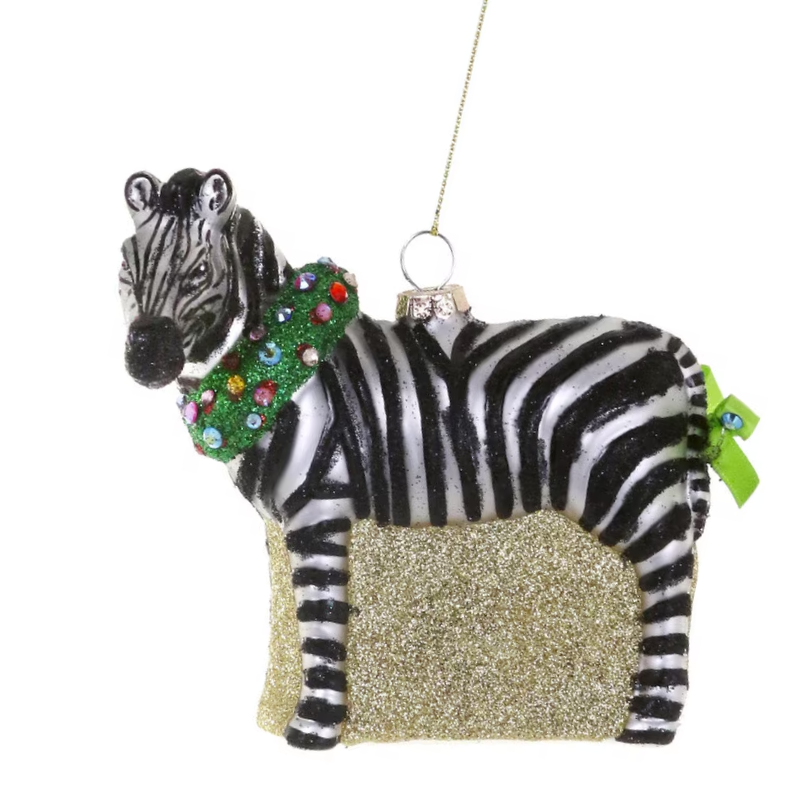 Glittered black and white zebra bedecked in a decorated holiday wreath and a bow on his tail.