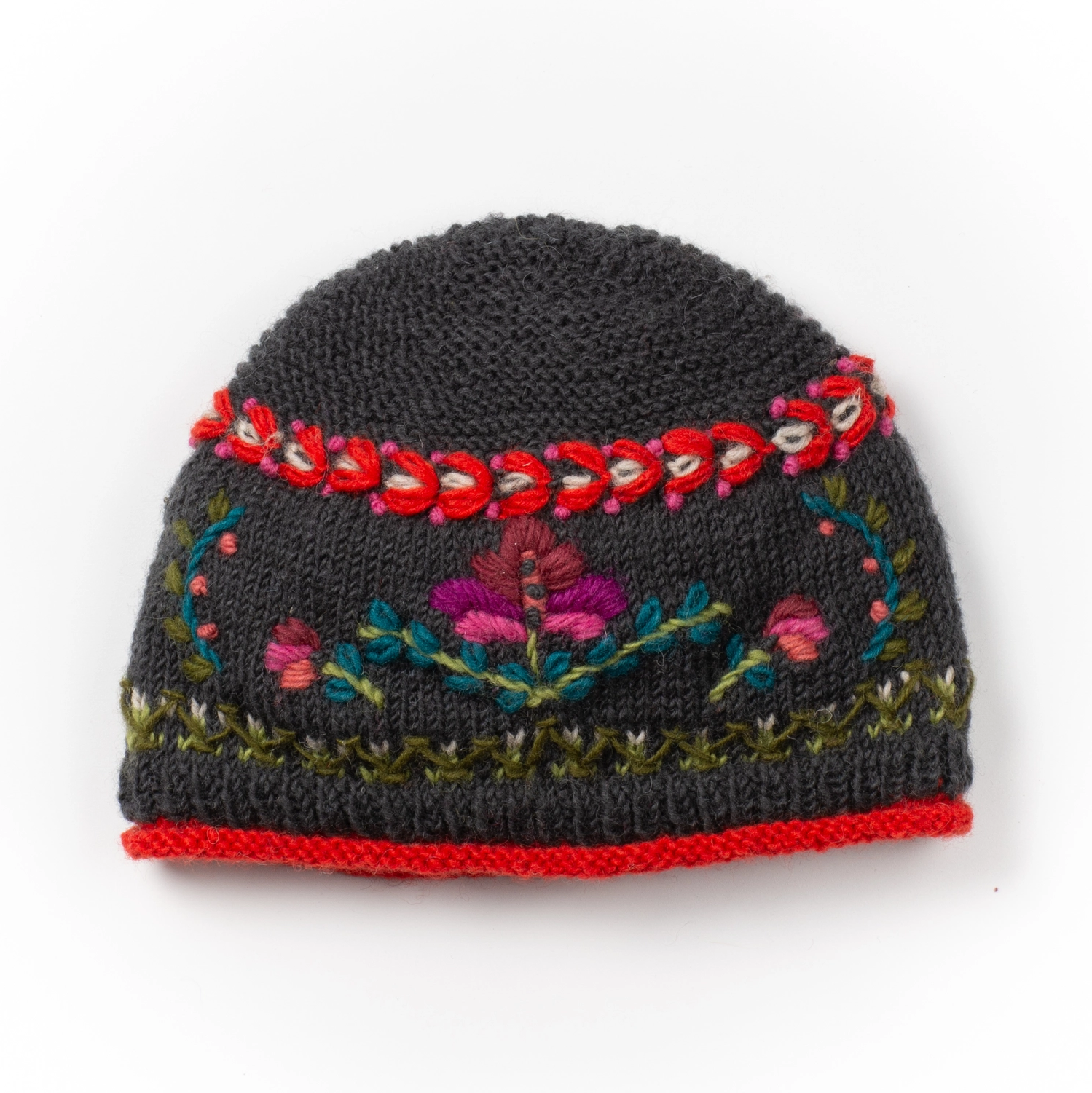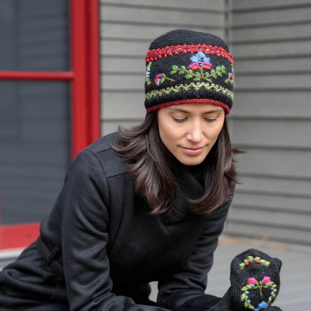 A delightful fusion of Bavarian tradition and modern comfort. This enchanting beanie hat features intricate embroidery inspired by the region's folk art, creating a visually captivating and culturally rich design. The vibrant colors add a lively touch to your winter ensemble, while the fleece lining ensures cozy warmth on even the coldest days. 100% wool, poly fleece lined. Made in Nepal, Fair Trade Federation member.