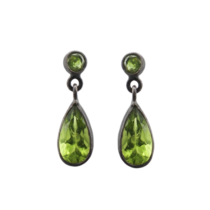 Luscious green peridot drop earrings, set in oxidized sterling silver which adds a touch of glamour. Sterling silver post backs. by Jane Diaz.