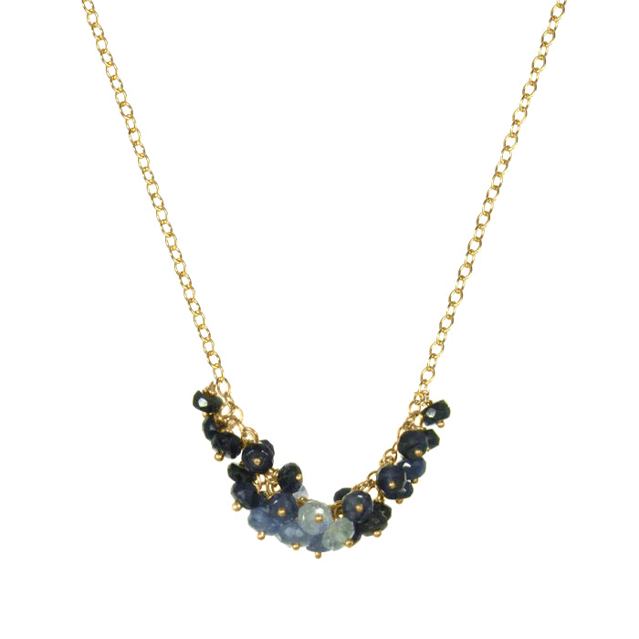 Cool blue sapphires in gradated shades of blue are hand-wired into a curving cluster on goldfill chain. By Catherine Weitzman