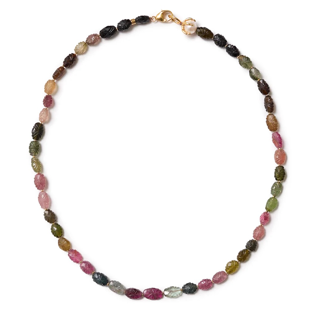 Delicate carved watermelon tourmaline flower beads form this necklace, fastening with an 18k gold vermeil claw clasp clutching a white freshwater pearl.