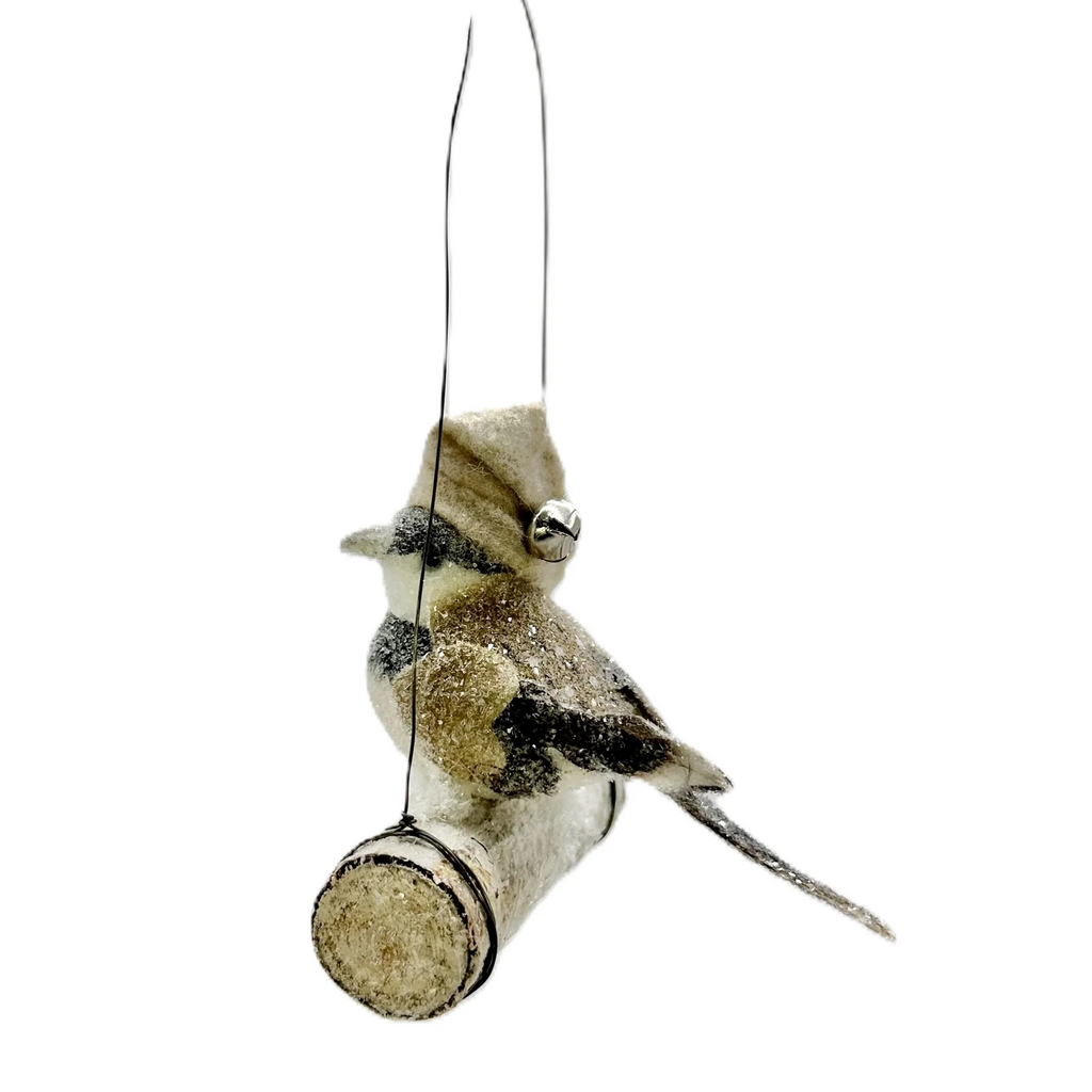 Winter Bird is glimmering with holiday spirit and topped off with a whimsical nightcap featuring a tiny jingle bell at the tip. Perched with poise on a delightful log swing.