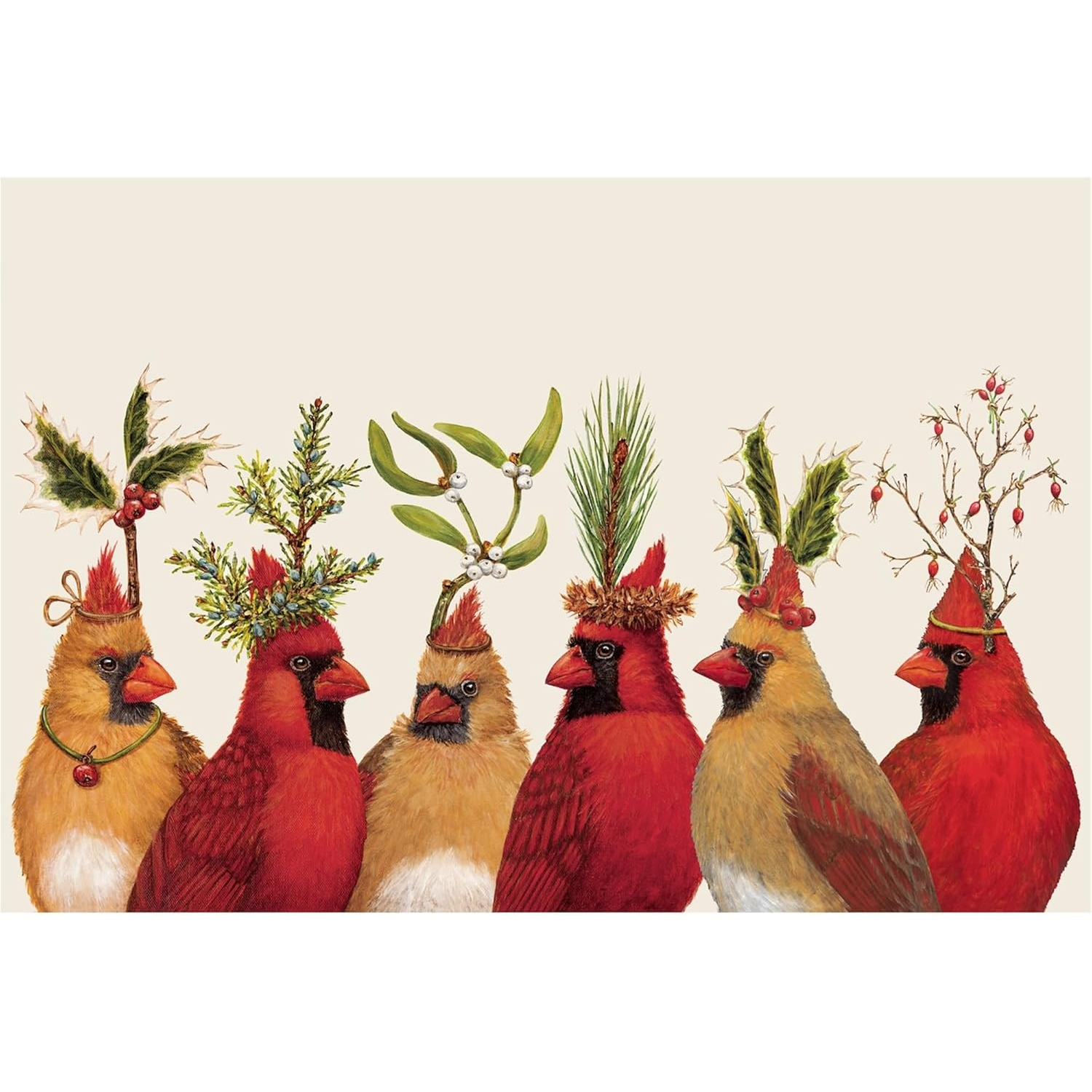 Cardinal Party presents an array of red and yellow cardinals decked out in holiday headdresses. By Vicki Sawyer.