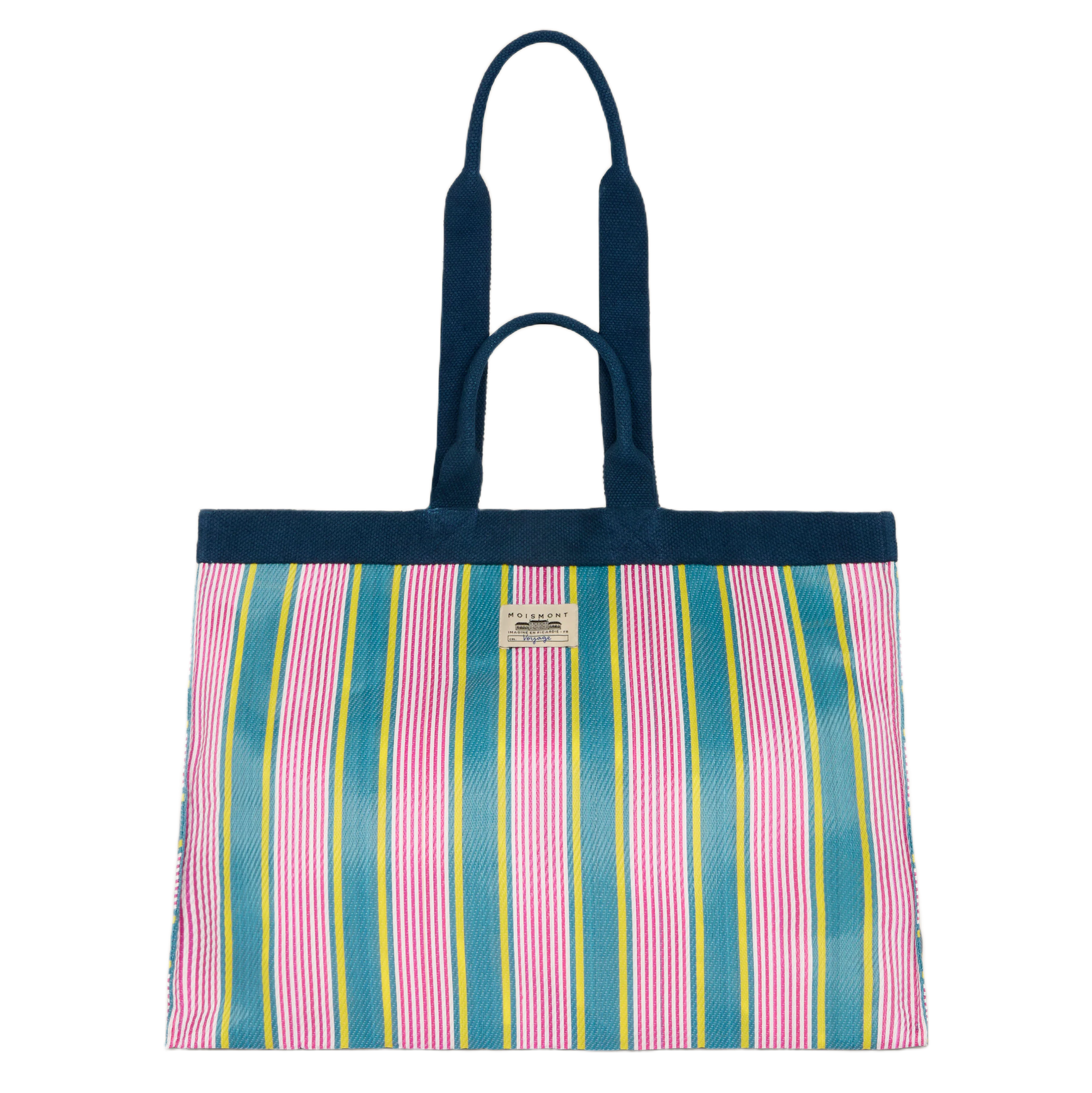 Lightweight, durable tote in happy stripes, crafted from recycled nylon. Its generous size easily accommodates your everyday essentials, with a handy interior pocket and a rigid base for added structure. Double handles allow for shoulder or hand carrying, while the snap closure and cotton trim provide a clean and polished look. A functional tote bag with a graphic style.