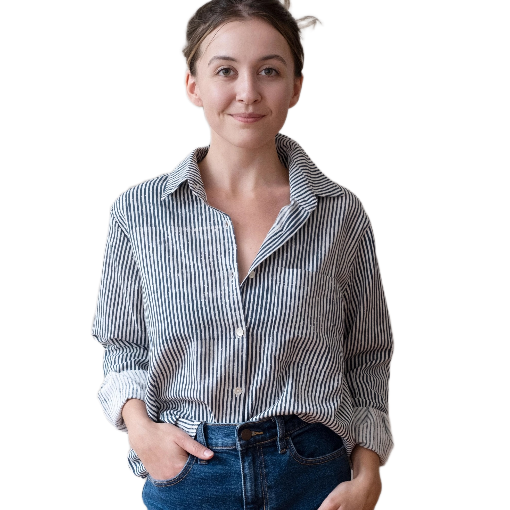 Classic navy and white striped button up in a soft cotton linen blend. Hand block printed with non-toxic, azo free dyes.