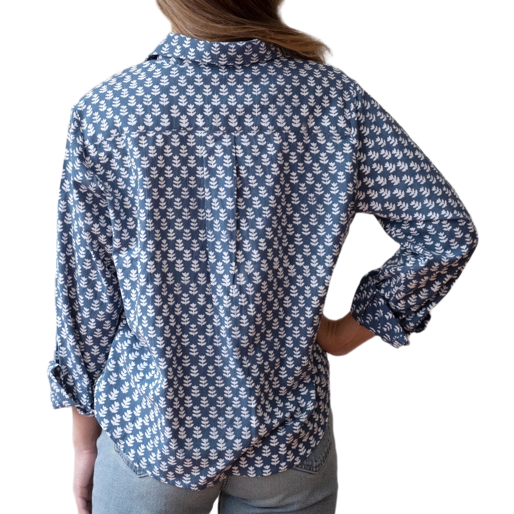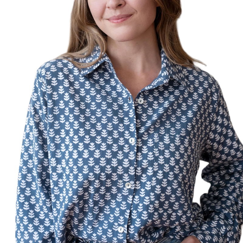 Lovely medium blue printed in crisp white with a stylized tulip motif on a soft cotton linen blend classic button up shirt. Non-toxic, azo free dyes. Machine wash cold with like colors. Hang to dry or tumble dry low to prevent shrinkage.