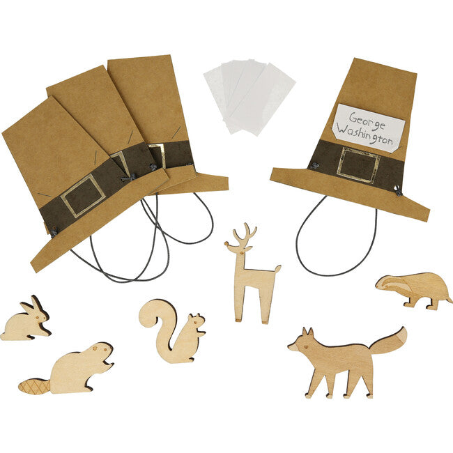 Crackers are such a fun way to kick off any holiday celebration!  These kraft paper turkeys have gold accents on their wings and fringes of tissue paper for feathers.  Each contains a pilgrim hat, a wooden animal keepsake and a joke.