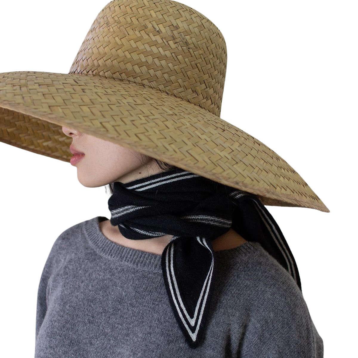 This lovely, almost weightless 100% cashmere scarf creates an instant impression. It’s knitted in a spindle-shaped design, which makes it lightweight and compact, yet still large enough to be worn in a variety of ways. The double border of white on the black gives it graphic impact.
